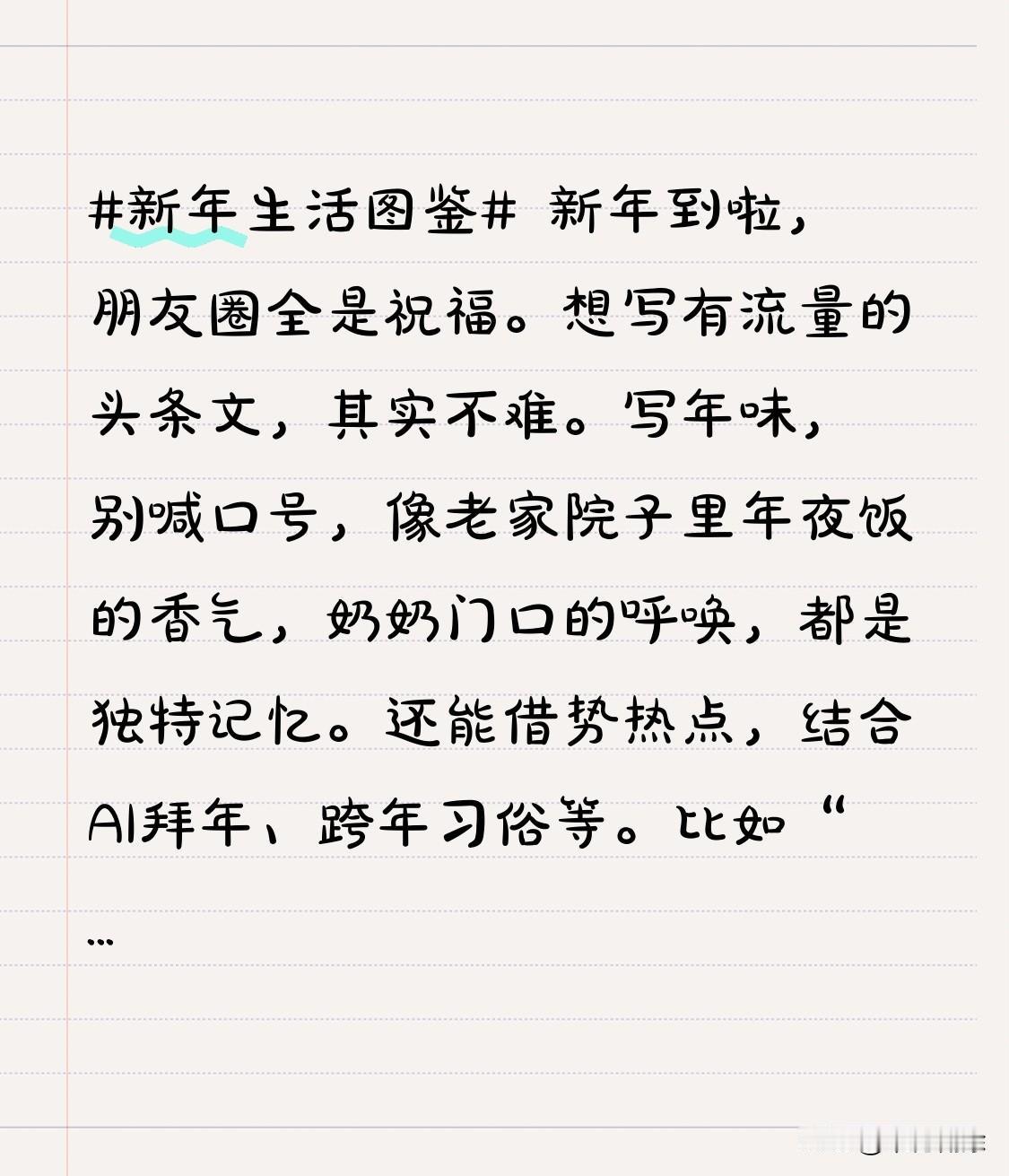 新年到啦,朋友圈全是祝福。想写有流量的头条文,其实不难。 写年味,别喊口号,像老家院子里年夜饭的香气,奶奶门口的呼唤,都是独特记忆。还能借势热点,结合AI拜年、跨年习俗等。 比如“马年见龙腾,辞旧迎新,最爱厨房偷尝菜的片刻”。新的一年,愿大家往事清零,幸福常伴!