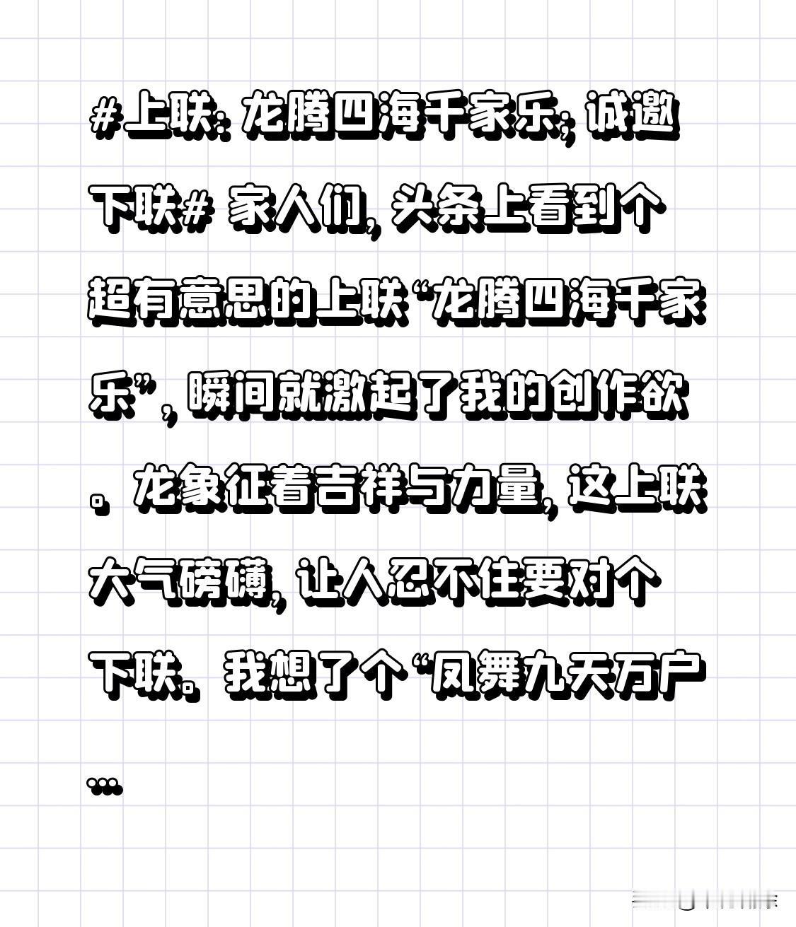 家人们,头条上看到个超有意思的上联“龙腾四海千家乐”,瞬间就激起了我的创作欲。龙象征着吉祥与力量,这上联大气磅礴,让人忍不住要对个下联。我想了个“凤舞九天万户欢”,龙凤呈祥,对仗工整,寓意也美好。大家要是有更好的下联,快在评论区分享,一起过过对联瘾!