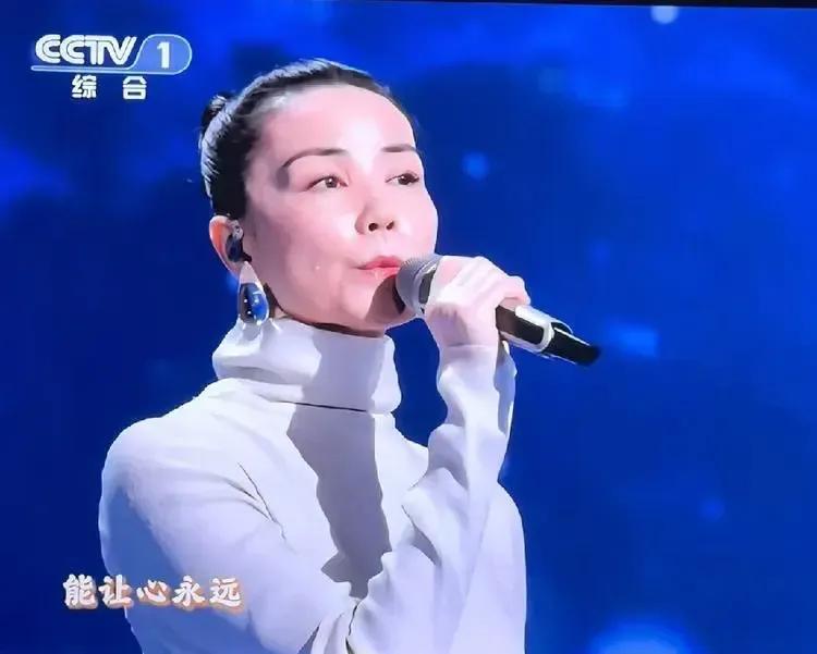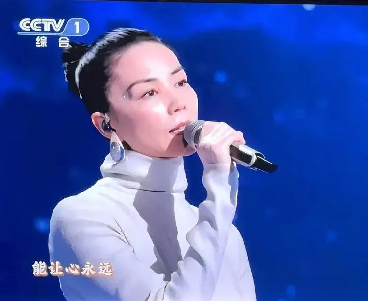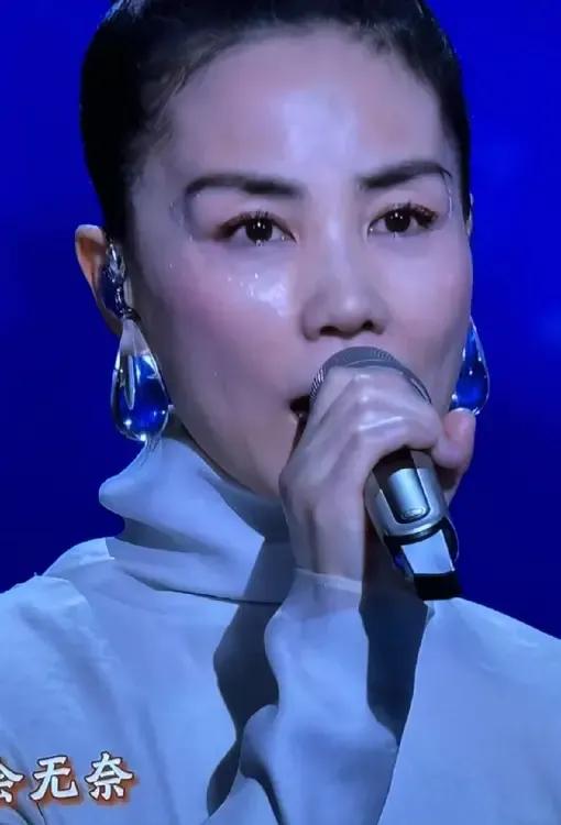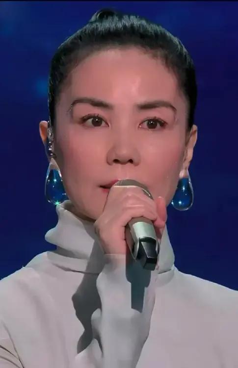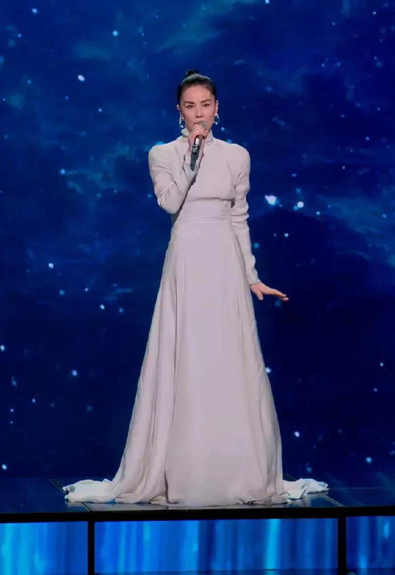 王菲的造型优雅而高贵, 眼尾点缀的泪钻如点点繁星, 晶莹的蓝色耳饰像深蓝色的夜空, 歌者的穿着打扮蕴含着歌词的内容, 这首歌适合在静静的夜里独自用心听。