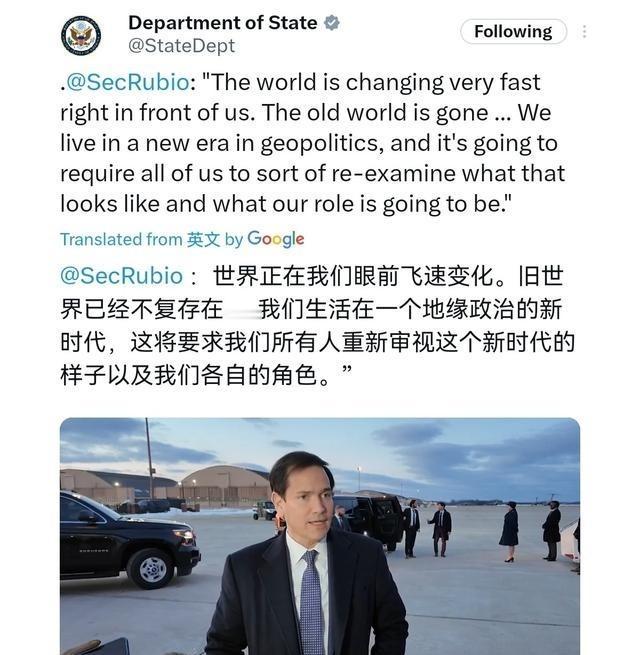美国国务卿鲁比奥当着120个国家的面,亲口宣告由美国主导的世界秩序彻底结束了!2月13日,鲁比奥表示,世界正快速变化,地缘政治正迎来“新时代”。世界正在我们眼前飞速变化,旧世界已经一去不返,我们生活在一个地缘政治新时代,这将要求我们所有人重新审视它的格局以及我们各自的角色。 想象一下,当全球上百个国家的代表齐聚一堂,美国最高外交官突然抛出重磅宣言,旧有国际体系轰然崩塌,新格局悄然来临,这会不会彻底颠覆各国对未来的预期? 马可·鲁比奥1971年出生在迈阿密,父母是古巴移民,父亲做调酒师,母亲干清洁和零售工作,让他从小就熟悉移民社区的艰辛。 一家人曾去拉斯维加斯住几年,他亲眼看到父母为养家拼命干活,1985年回佛罗里达后,上南迈阿密高中,毕业靠足球奖学金进塔基奥学院念书一年。转到圣达菲社区学院,继续学业,1993年在佛罗里达大学拿政治科学学士,1996年从迈阿密大学法学院毕业,获法学博士。 读书时为共和党议员伊莱安娜·罗斯-莱蒂宁打工,处理社区事宜,这让他初步接触政界。毕业后练律师,同时搞地方政务,1998年选上西迈阿密市委员会委员,次年当主席,管城市预算和基建。 2000年通过特别选举进佛罗里达州众议院,2003年成多数党领袖,推动税收减免和学校券计划。2006年选众议院议长,任内主导预算改革,砍州税并调教育资金分配。2010年争联邦参议员,在初选打败州长查理·克里斯特,三方比拼中大胜进国会。 作为参议员,他专攻外交政策、情报和拉美事务,当外交关系委员会高级成员和情报特别委员会副主席,出访拉美多国,推动对古巴和委内瑞拉制裁。2016年参加共和党总统初选,强调移民控制和保守原则,虽没提名但全国出名。2022年第三次连任参议员,继续审情报报告,推动对华策略。 2024年大选支持特朗普,提供外交建议,2025年1月20日经参议院确认,任国务卿,掌管美国对外事务。说实话,鲁比奥的路子挺接地气,从地方起步,一步步爬到顶层外交岗位,靠的就是对移民和外交的专注。 慕尼黑安全会议上,约120国代表出席,鲁比奥2月13日在飞往德国途中对记者表态,全球形势剧变,需要各国适应。 次日正式演讲,他指出旧国际体系无法应对挑战,各国须重新定位职责。演讲中批评后冷战时期幻想导致工业外移和移民问题,联合国等机构在阻止冲突上失效,要求西方国家加强国防和经济独立。呼吁美欧维护共享遗产,强调美国拒绝当西方衰落的看护者。 代表们反应不一,有人认可,有人交换看法。会场外,记者记录各国反馈。这番话其实反映美国承认单极主导时代过去,全球格局已变,美国得接受现实。 对盟友来说,美国不会再让它们白搭车,大国竞争会更激烈,美国从主导全球转向防其他势力崛起,联合国机制失灵,全球治理难上加难。某种程度,世界像进入战国时代,美国带头适应。说白了,这不是突然的,美国早意识到多极化趋势,不得不调整策略,避免继续亏损。 美国表态后,各国开始审视联盟,对欧洲伙伴,美国要求加大国防支出,别总靠华盛顿军事支持。全球大国摩擦升级,美国聚焦防其他势力主导关键领域,国际组织效能降,协调障碍多。形势像历史多极竞争,美国主动融入,推动再工业化和边境控制。 鲁比奥慕尼黑后,继续外交,2月14日和七国集团外长谈乌克兰冲突和伊朗,推动结束战争。欧洲领导人如欧盟委员会主席冯德莱恩欢迎但谨慎,观察实际行动。美国推进伊朗核谈,鲁比奥日内瓦主持,监督协议,还管委内瑞拉稳定。全球反应分化,一些国家重估对美关系,推动本土制造业。 美国坚持优先原则,鲁比奥出席峰会,推动政策。整体看,这转变让盟友警醒,美国强调互惠,不再单方面付出。欧洲得增加军费,共享负担,否则联盟松动。 全球治理挑战大,联合国作用弱,需新机制应对竞争。鲁比奥继续任国务卿,处理国际谈判,落实美国战略。说起来,这事接地气,美国人觉得旧秩序不划算,得改弦易张,其他国家也得跟上节奏,不然落后挨打。