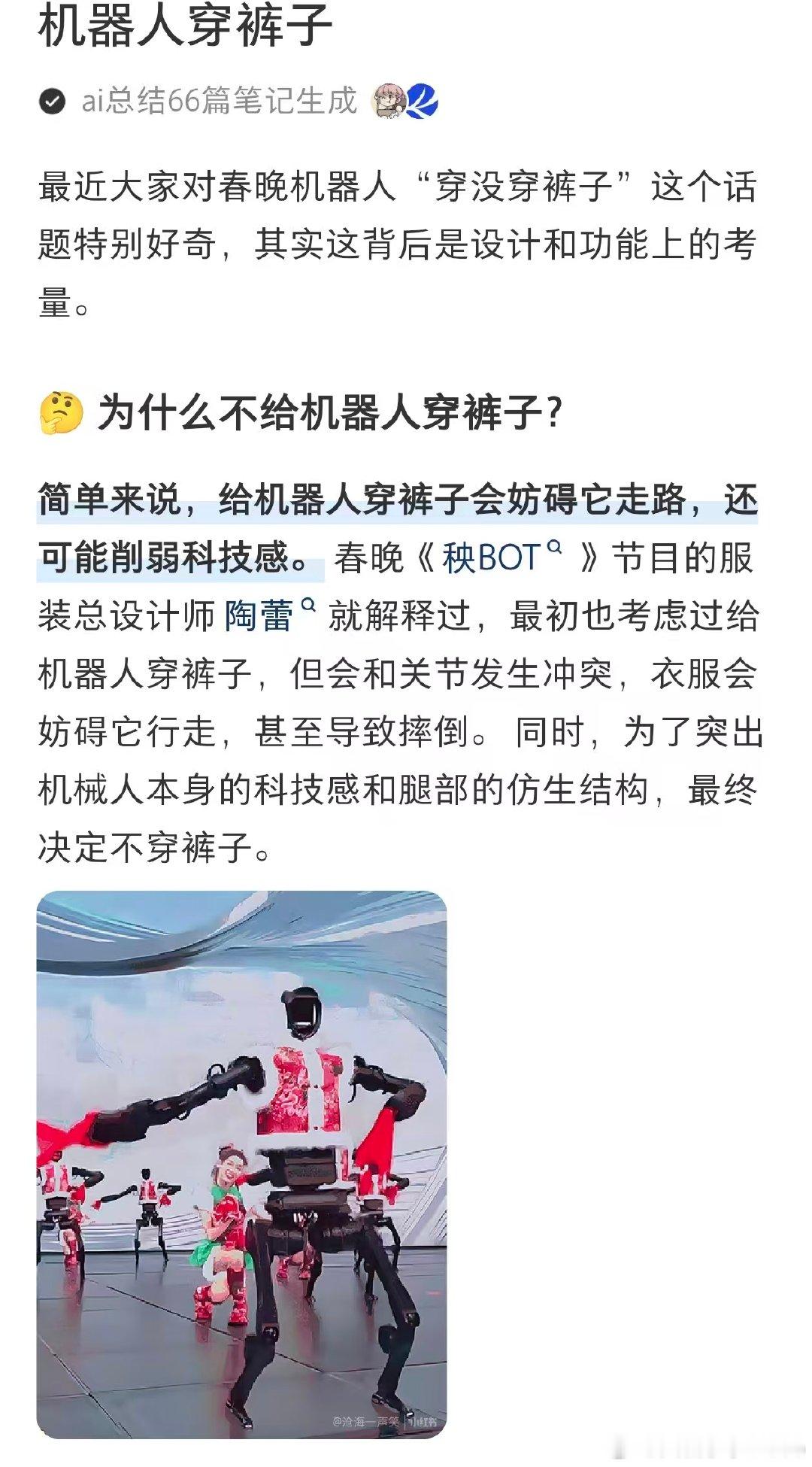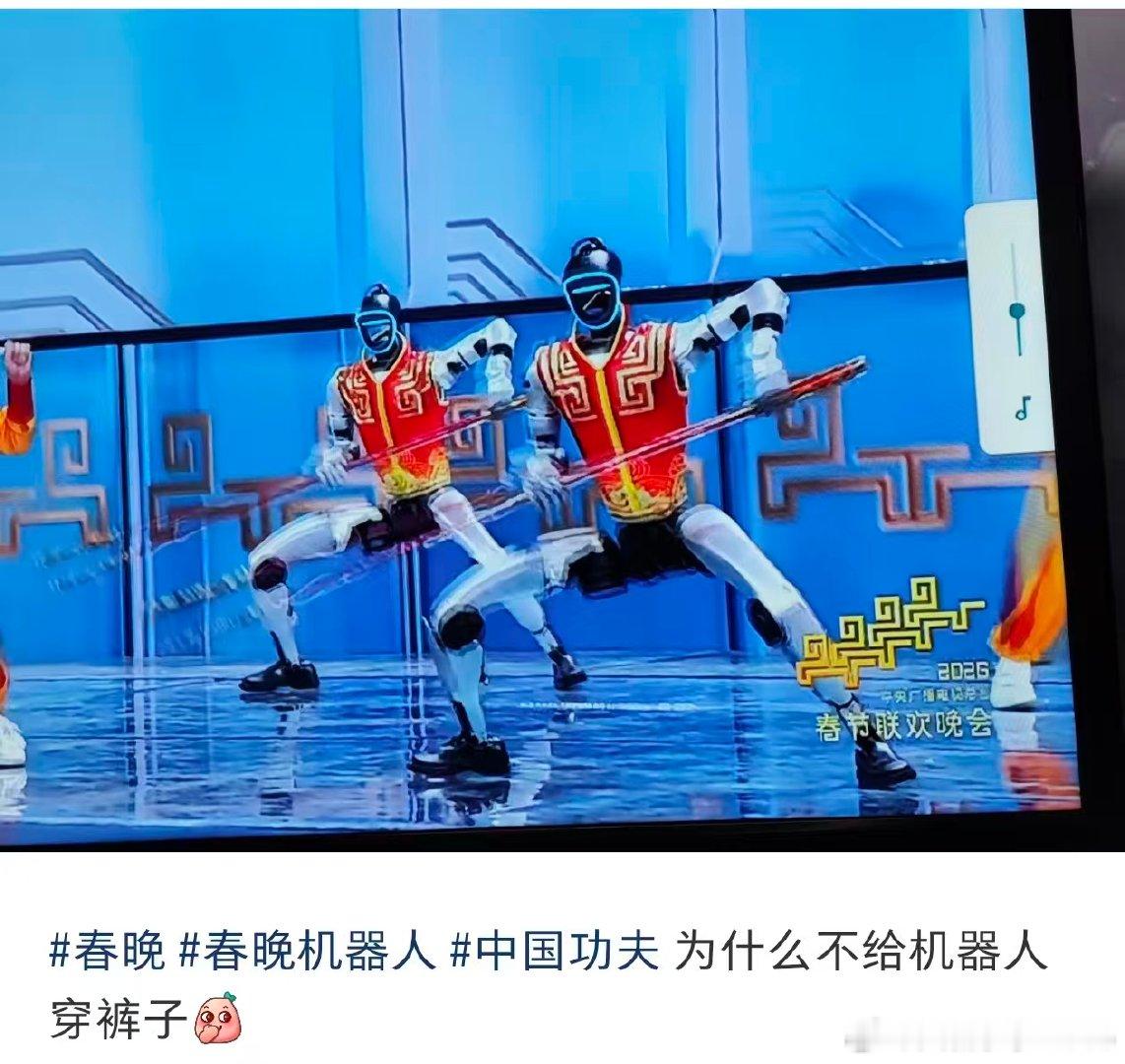 不少网友依然在好奇:为什么不给机器人穿裤子?去年春晚服装总设计师曾解释,裤子可能阻碍关节活动,导致机器人摔倒,且会削弱机械本体的科技感。