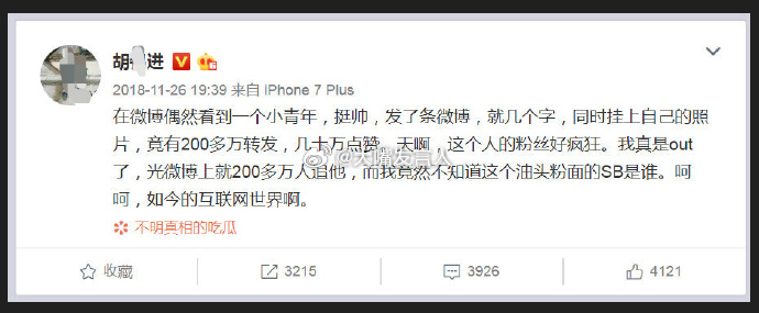 春晚看到范丞丞的节目(图3),想起某主编胡某进老师,在2018年11月26日发的一条微博,胡先生嘴脏直接骂人(图1),““在微博偶然看到一个小青年,发了条微博,就几个字,竟有200多万转发,几十万点赞~~而我竟然不知道这个油头粉面的**是谁””你看完,就能体会到,男人也有更年期病症,也会犯病发疯无端骂街同样是这个货,在2023年发微博说(图2),“人身攻击、诽谤、构陷,对中国互联网是一种毒化”他怎么不尿泡尿照照他自己?!马丽单飞了 沈腾怎么办,过年好,热点观点