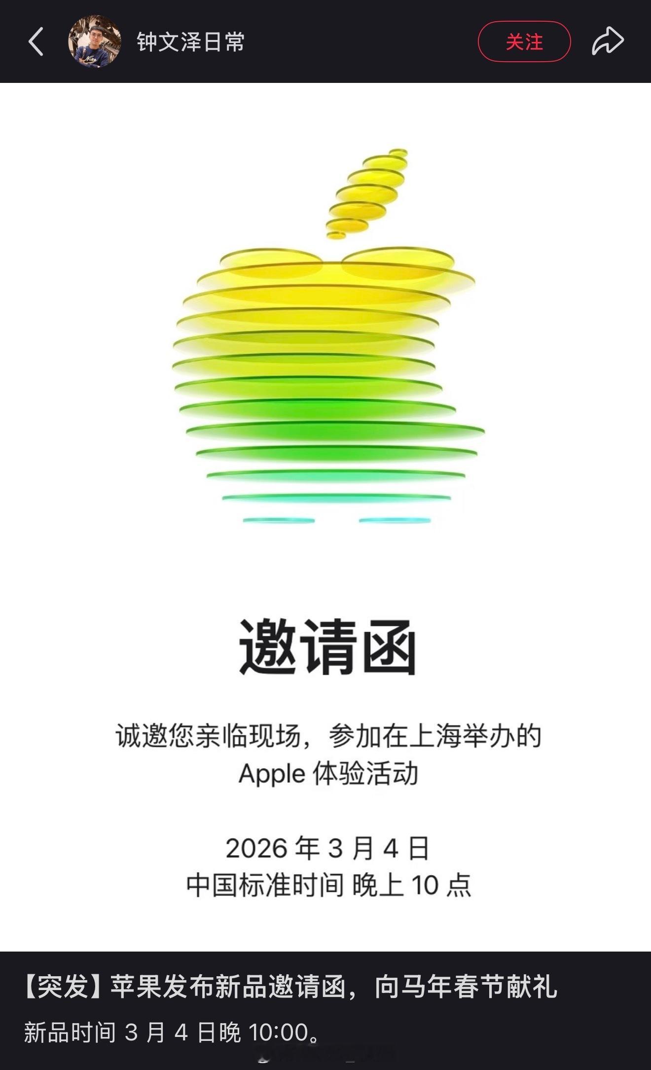 我的天…刷个🍠结果看到钟文泽的苹果发布会的邀请函3月4日哈估计是苹果的春季发布会了iPhone17e真的要来咯,估计还有iPad mini 8?iPhone 好了新年回去又有得忙啦