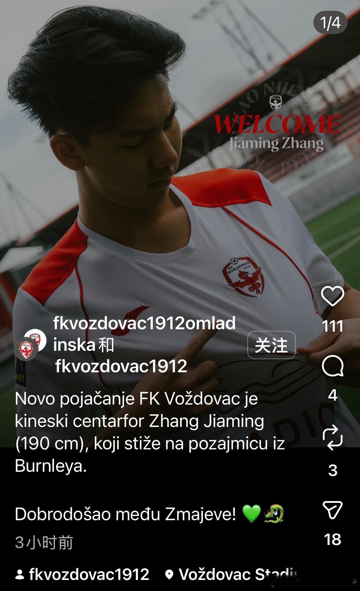 辽宁铁人张家鸣 塞尔维亚沃日多瓦茨足球俱乐部官宣张家鸣加入。【官宣原文】FK沃日多瓦茨的新援是中国中锋张嘉鸣(190厘米),他以租借形式从伯恩利加盟。欢迎加入“龙队”!