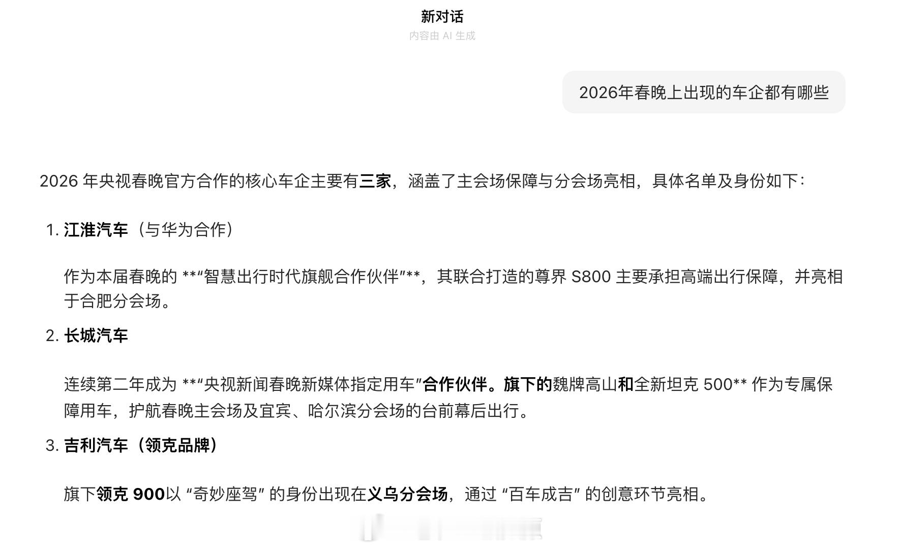 传播就是这个思路,要不停地做,重复的做,才能触达更多的人群,让更多的人知道。今年春晚上有不少车企都或多或少的露脸了,这就是一个思路的转变,大众认可的车,才是好车。酒再香,现在也要有人领着进巷子才行,不然在巷子口可能就喝饱了~(名单来自于豆包)春晚大v聊车老霍随便聊