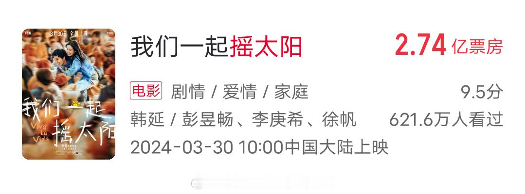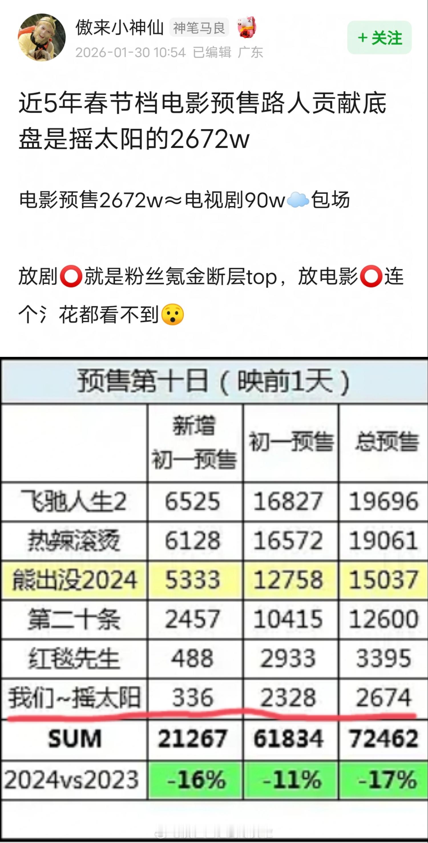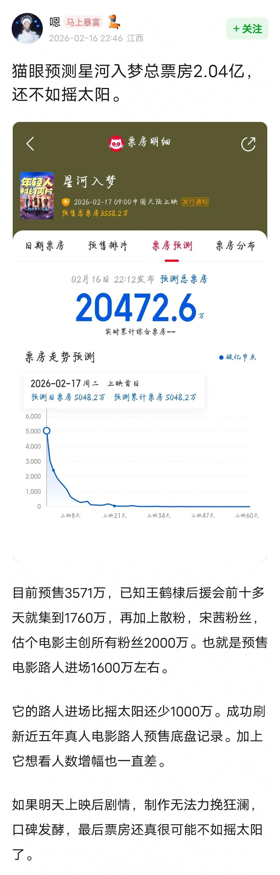 猫眼预测《星河入梦》总票房2.04亿,不及韩延前作摇太阳2.74亿。目前预售3620万,预计王鹤棣宋茜粉丝贡献2000万左右预售,也就是路人进场1600万,比摇太阳还少1000万,刷新近五年真人电影路人预售底盘记录。。。星河入梦 春节档