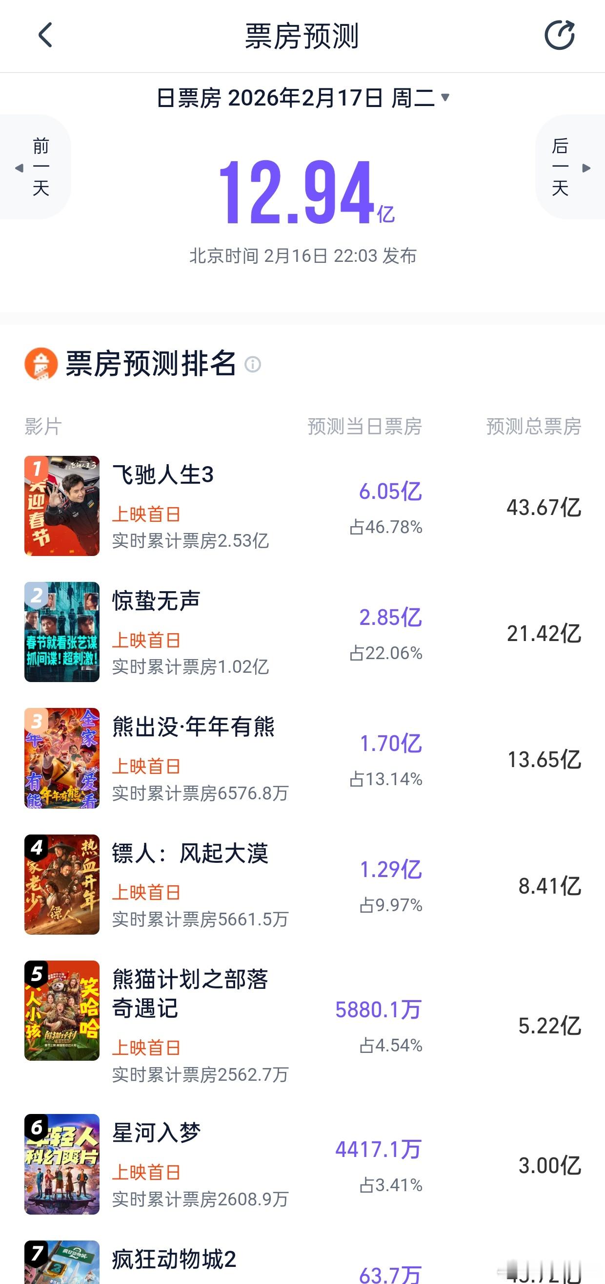 听听温特怎么说 猫眼灯塔预测《飞驰人生3》42亿—43亿,《惊蛰无声》16亿—21亿,《熊出没》11亿—13亿,《镖人》八九亿,《熊猫计划2》四五亿,《星河入梦》两三亿
