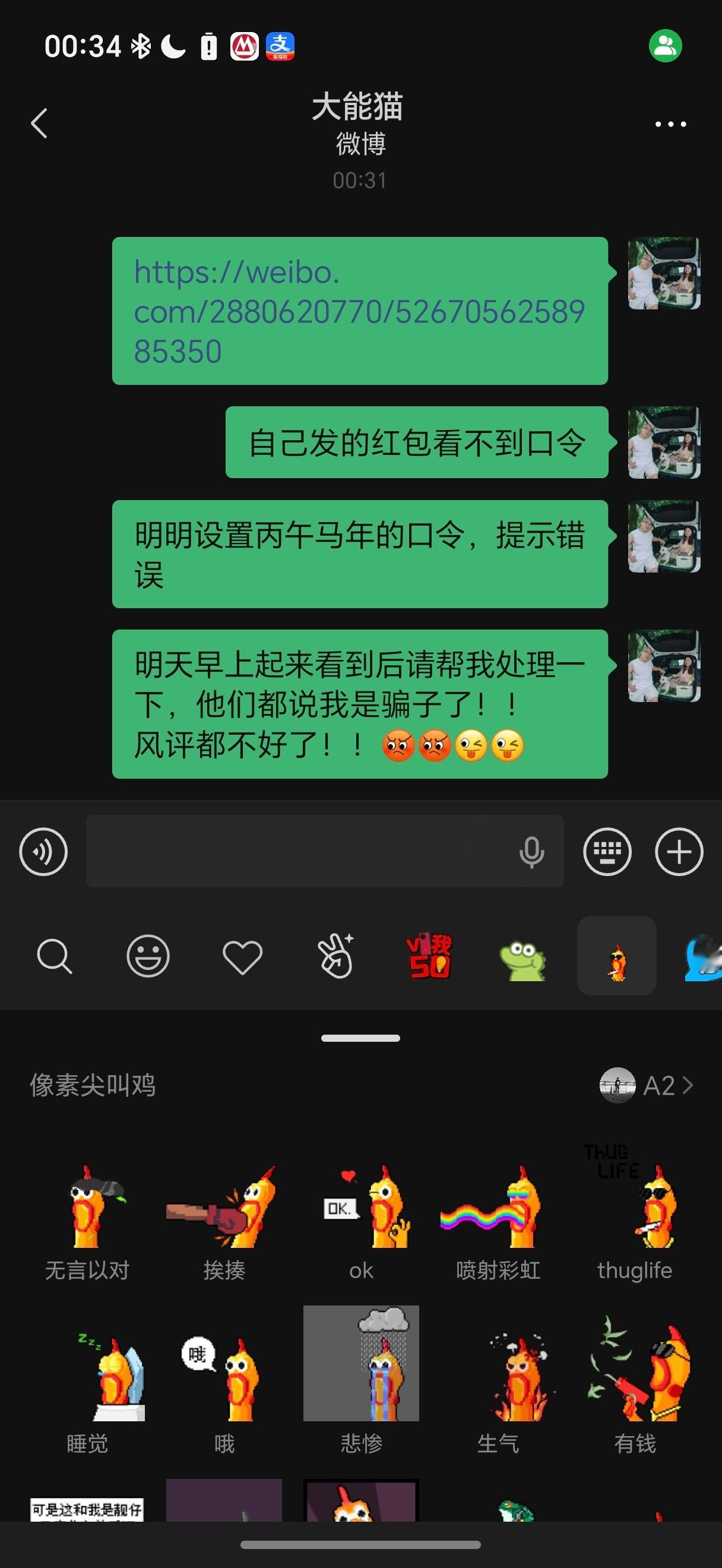 微博红包这个产品经理我觉得该挨骂了…自己发的红包也不能看到口令是啥了?明明设置的口令是丙午马年,但是就是错误,我还发了两次,都不对明天早上起来我问问他们怎么回事!大家晚安,早点睡觉哦
