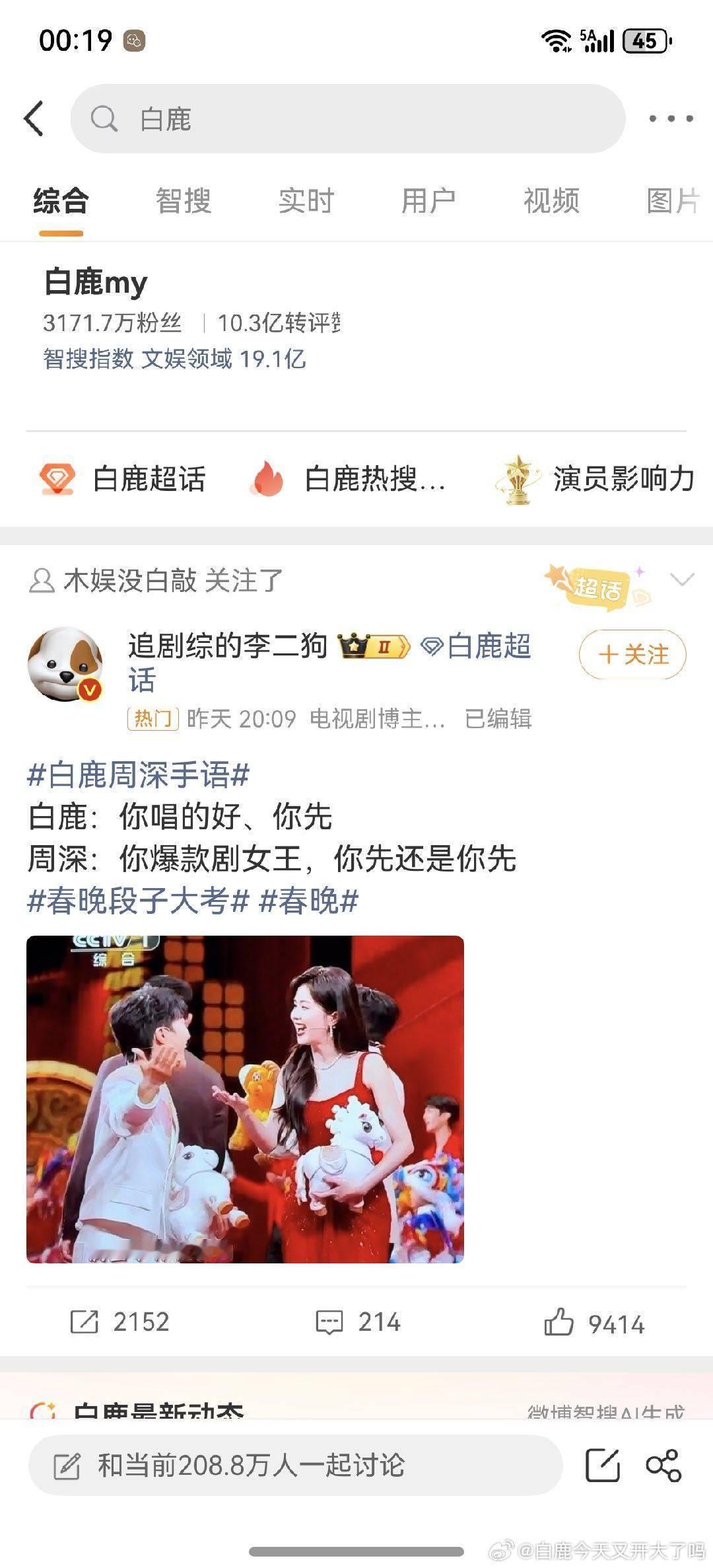 网友截图想问,白鹿这智搜指数是多少?这是几个亿?我以为白鹿微博访问量破千万就够高了,没想到智搜指数竟然都19.1亿了!今年春晚白鹿太火了!太火了!