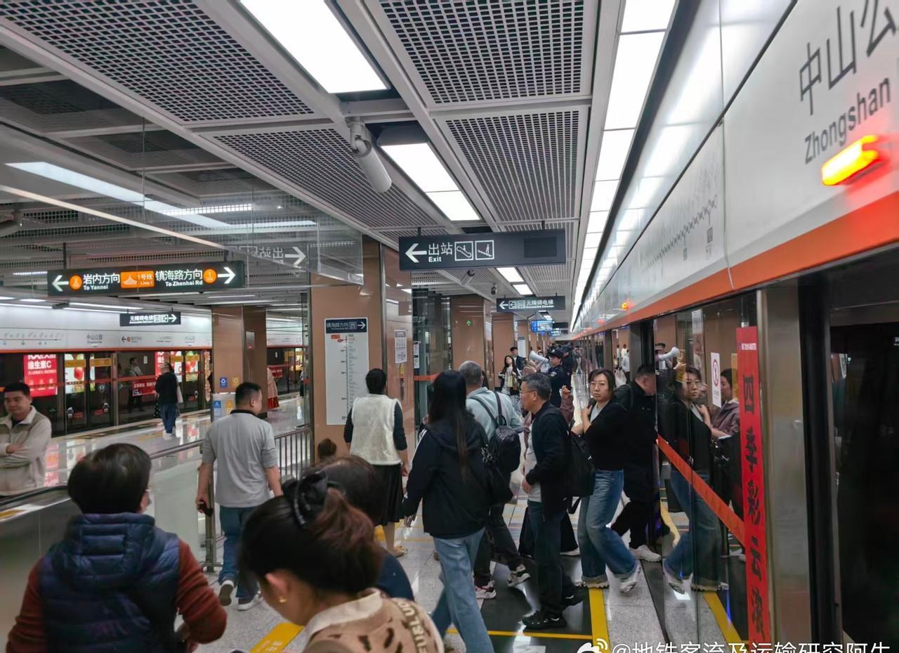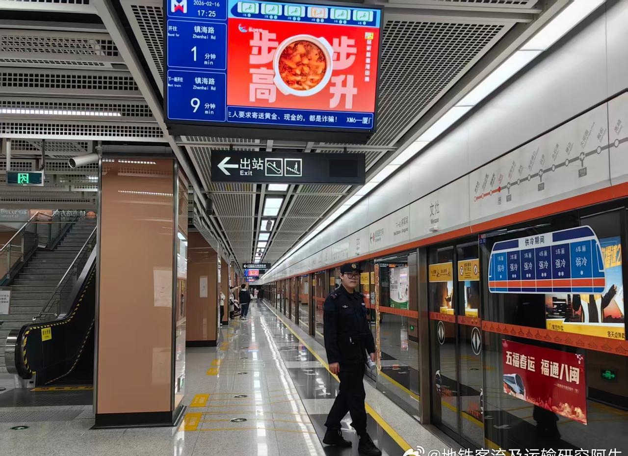 17:25,厦门地铁1号线文灶站物业空间(P1),文灶站站台客流情况(P2),文灶站往镇海路方向地铁车厢客流情况(P3-P4); 17:31,一号线中山公园站站台下客情况(P5); 17:35,1号线中山公园站3b出口,街上略显冷清(P6)。