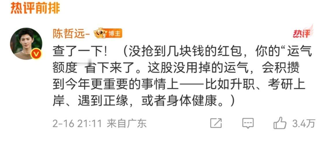 发了25万任何人可领的红包,还安慰没抢到的人,我也支持陈哲远951,虽然我没有抢