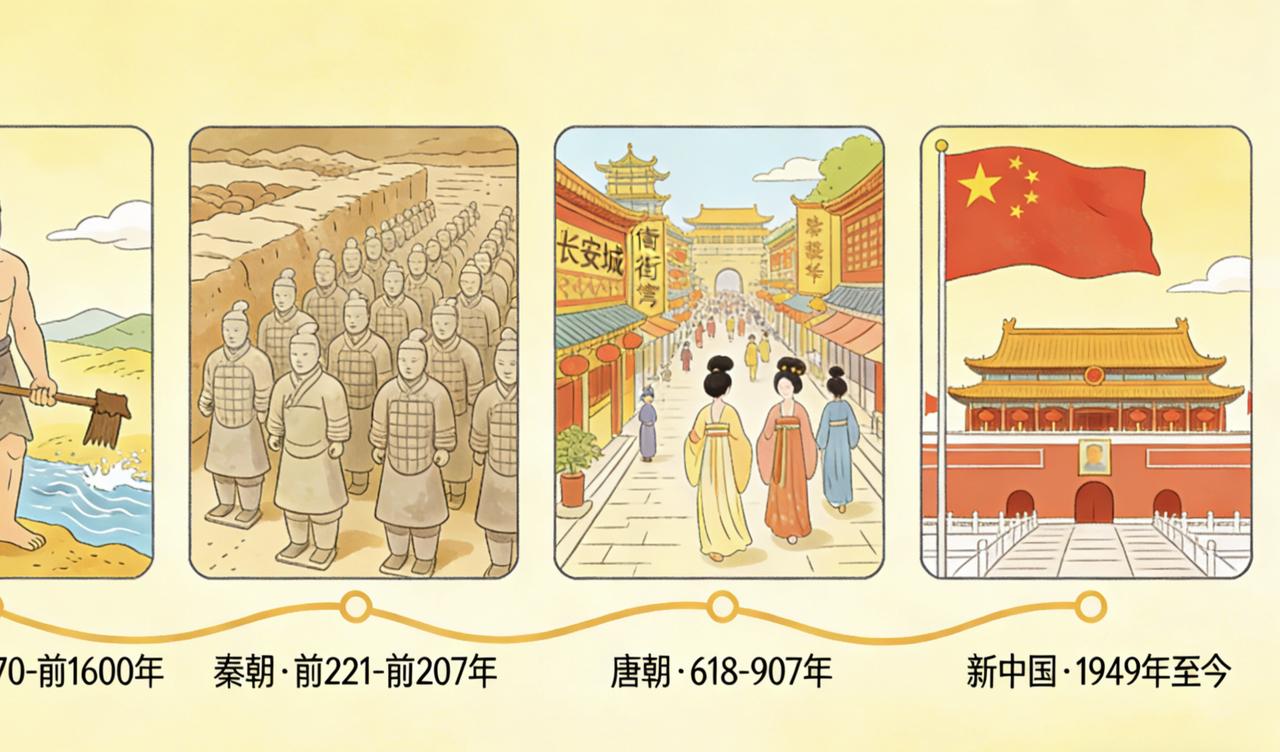 一口气看懂中华4000年通史:从夏朝开国到新中国成立,全程高能无废话 中华上下五千年,真正有王朝记载的历史近4000年,从大禹建夏到新中国诞生,无数王朝更迭、英雄起落,一篇带你快速看完! 公元前2070年,大禹治水成功建立夏朝,开启“家天下”世袭制,历经太康失国、少康中兴后,夏桀残暴被商汤所灭,商朝登场。商朝多次迁都,盘庚迁殷后走向强盛,最终因纣王无道,周武王牧野之战灭商建西周。 西周分封天下,却因周幽王烽火戏诸侯亡国,平王东迁后进入春秋战国,春秋五霸争霸、战国七雄兼并,商鞅变法让秦国崛起,公元前221年,秦始皇嬴政一统六国,建立首个大一统王朝,书同文、车同轨,奠定千年格局。 秦二世而亡,楚汉之争后刘邦建立西汉,文景之治、汉武盛世铸就强盛,后王莽篡汉建新朝,刘秀复国开创东汉。东汉末年分三国,司马家篡魏建晋,八王之乱引发五胡乱华,中国进入南北朝大分裂时期。 公元581年,杨坚建隋统一全国,大运河贯通南北,却因隋炀帝暴政速亡。李渊建立唐朝,贞观之治、开元盛世达到巅峰,安史之乱后由盛转衰,最终走向五代十国的分裂。 赵匡胤陈桥兵变建北宋,重文轻武却难逃靖康之耻,南宋偏安江南,被蒙古铁骑所灭。忽必烈建立元朝,实现大一统,后因民族压迫被朱元璋推翻,明朝建立。 明朝历经永乐盛世、土木堡之变由盛转衰,后金崛起后入关建立清朝,康雍乾盛世达到顶峰,却在晚清闭关锁国,遭遇列强入侵,沦为半殖民地半封建社会。 1911年辛亥革命推翻封建帝制,1921年中国共产党成立,历经抗日战争、解放战争,1949年10月1日,中华人民共和国成立,4000年王朝历史落幕,华夏迎来全新篇章。 从奴隶制到封建制,从分裂到统一,中华历史跌宕起伏,这就是刻在中国人骨子里的文明传承!