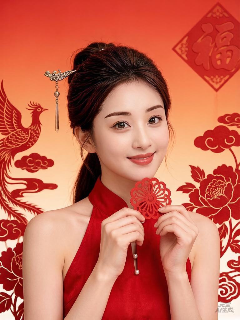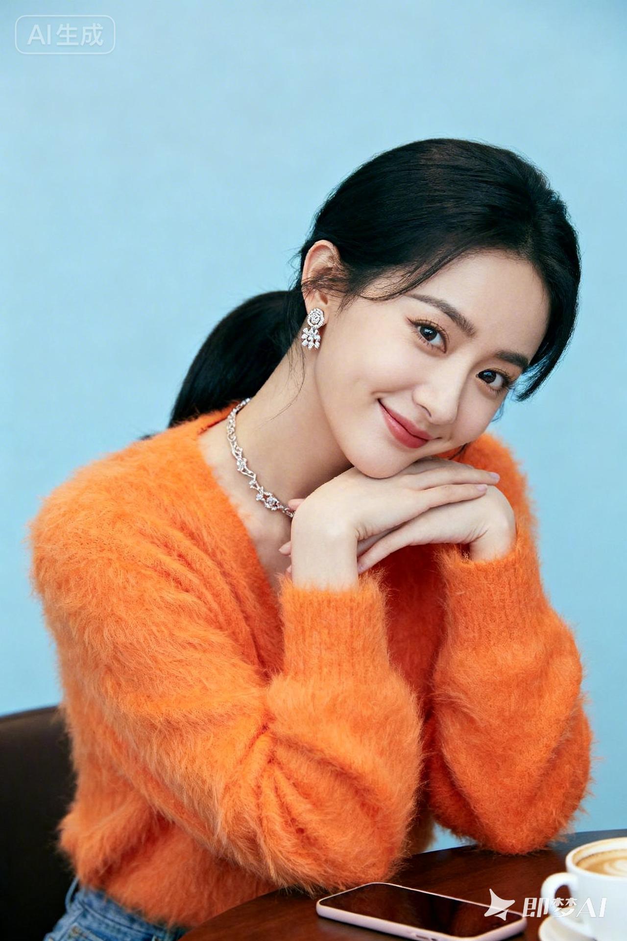 中国绝色美人,肌肤白皙细腻光滑,高盘微卷长发,佩戴精致项链耳环。身着咖色绣花毛衣