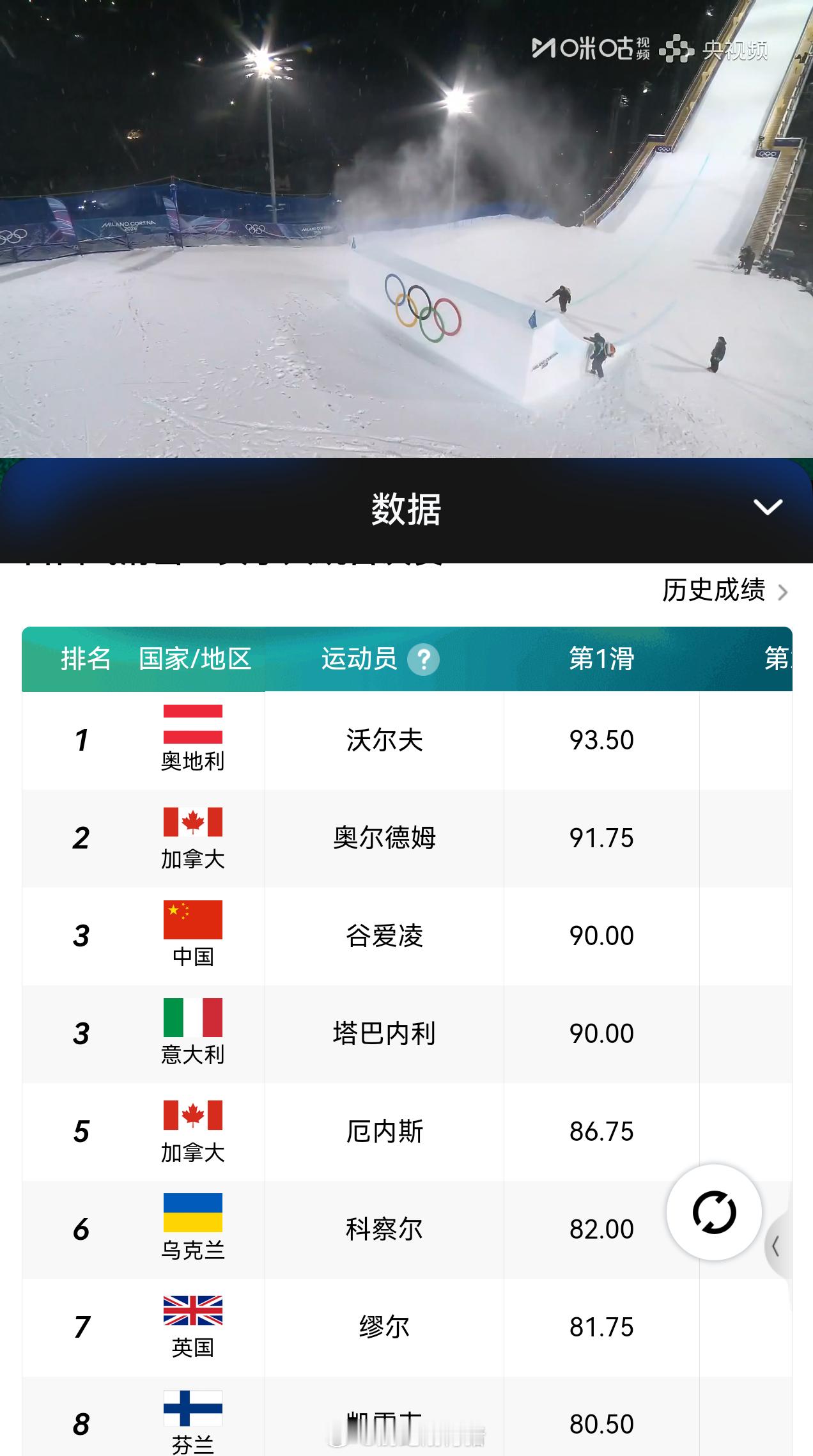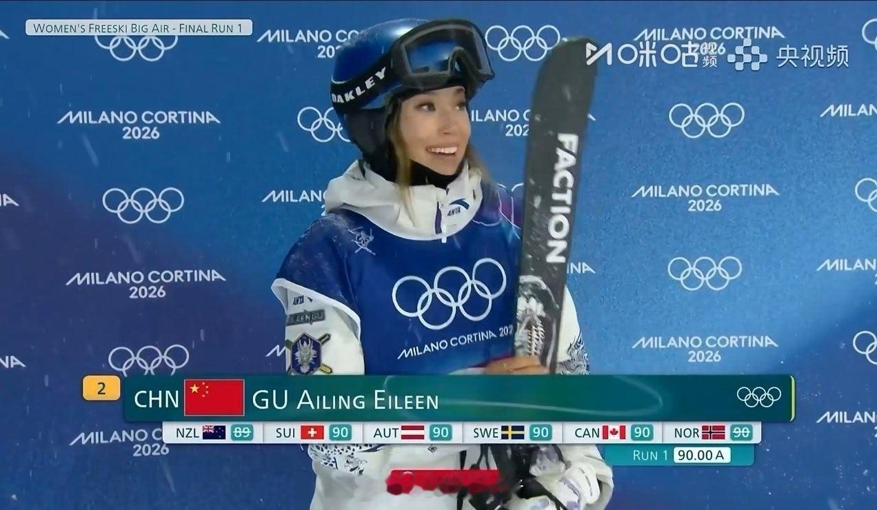 谷爱凌第一滑也拿到了90分的高分!!跟前面两名拿90分的选手咬住了!
