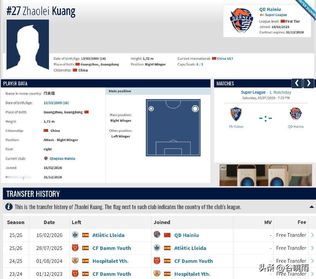 邝兆镭的身高终于有权威的数据了! U17国青的主力球员正式以自由身加盟青岛海牛队,德转也更新了他的数据。 球迷们发现小邝的身高是172cm,这是小邝的身高第一次有一个公开权威的数据。 过往小邝的身高一直是球迷讨论的焦点。看好他的球迷认为他已经175cm了,无论踢中场还是边锋足够了。 不看好他的球迷认为他只有170cm,这样的身高很难在现代足球领域有所成就。 个人认为小邝踢边锋172也够用了,但是要加强身体硬度和宽度,他的身板还是偏小。像韩国李刚仁,鲁能谢文能也都不高,但身板比较宽。 除夕的下午小邝的干爹董路也介绍了小邝的留洋过程,可以说三年留洋之路太坎坷了。 刚登陆西班牙参赛证办不下来,而最后去了西协乙莱利达还是参赛证办不下来,实打实的只是在达姆踢了完整的一年正式联赛,但是数据还不好,只进了2个球。 而且这三年还伴随着伤病,几乎每年都要回国进行康复训练。 个人认为凭小邝的能力和努力以及自律踢中超应该没有问题,只是希望他远离伤病,鹅足炎别再骚扰他就好了。 祝福小邝回到国内一帆风顺!