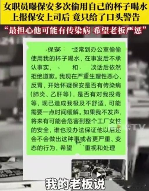 广东中山,一家公司的女职员小陈平时就爱喝茶,每天上班都会泡上一杯。前阵子有天傍晚,她下班前忙着手头的活,泡好的热茶没来得及喝,随手放在工位上就走了。第二天一到办公室,她一眼就发现杯子空了,还被擦得干干净净,起初以为是同事顺手喝了,没太在意,可连着几天都这样,她越想越不对劲,调了办公区监控,看到竟是公司保安每天都偷喝她的茶,动作熟练得不行,一看就不是第一次。 话说,这个小陈平时的性子就挺温和的,待人也客气。 她喝的不是什么名贵茶,就是自己在家带来的普通绿茶,图个上班解乏。 那天调完监控,她盯着屏幕看了好几遍,越看越恶心。 监控里显示,每天凌晨五点多,保安老王趁着清洁办公区的空档,都会悄悄走到她的工位前。 他也不慌,先左右扫一眼,确认没人,就慢悠悠拿起小陈的保温杯,拧开盖子直接对着嘴喝。 喝完之后,还会把杯子里剩下的茶叶倒了,用纸巾把杯口擦干净,再放回原位,伪装得毫无痕迹。 小陈数了数,这种行为竟然持续了22天,也就是说,她这大半个月,差点天天用被别人喝过的杯子。 当时她就忍不住了,捂着嘴跑到厕所干呕,胃里翻江倒海的。 换做谁,自己天天用的杯子,被一个陌生男人偷偷反复用,能不膈应吗? 小陈缓过劲来,第一时间就去找了保安的上司,也就是公司的行政主管。 她把监控录像给主管看,要求公司严肃处罚老王,还要他公开道歉,另外赔偿自己一个新杯子。 可主管看完,一脸无所谓的样子说:多大点事,不就是喝了几杯茶吗,我口头警告他几句,让他以后别这样了就行。 小陈当时就急了,跟主管争辩,说这不是喝茶的问题,是侵犯她的权益。 可主管根本不听,还暗示她,职场没必要这么较真,别小题大做,免得大家都不好看。 其实小陈也知道,主管大概是觉得,保安工资不高,辞退还要赔补偿金,能省事就省事。 可她咽不下这口气,自己没做错任何事,凭什么要忍气吞声? 她没再跟主管纠缠,直接找到了公司老板,可老板当时正在外地出差,没法立马处理。 老板在电话里听完小陈的诉求,倒是没敷衍,说等他出差回来,一定彻查,给她一个公正的说法。 这事公司里的人得知后,议论声就没断。 有人说小陈太矫情,不就是几杯茶,至于闹到老板那里吗? 还有人出馊主意,让小陈干脆每天多泡一杯,送保安一杯,化解矛盾。 小陈听到这些话,更委屈了。她觉得自己不是小气,是这种行为本身就很过分,私人用品被人擅自使用,换谁都接受不了。 其实很多人都有个误区,觉得小事没必要计较,可越是小事,越能看出一个人的边界感。 保安老王明明知道,那是别人的杯子,是别人泡的茶,不是公共物品,却还是故意偷喝。 他利用自己的工作便利,偷偷进入办公区,侵犯的不只是小陈的财产,还有她的隐私和人格尊严。 保安老王的行为,违反了《民法典》第113条和第114条明确规定,民事主体的财产权利受法律平等保护,自然人依法享有物权,对自己的物品有直接支配和排他的权利。 小陈的保温杯、茶叶,还有泡好的茶,都是她的私人财产,她有绝对的所有权,别人没经过她同意,根本不能擅自使用。 老王未经小陈许可,反复偷喝她的茶,还动用她的私人杯子,已经侵犯了小陈的财产权,属于侵权行为。 有人说,一杯茶值不了几个钱,够不上违法吧? 其实不是这样的,侵权不分金额大小,哪怕是一块钱的东西,只要是别人的私人财产,擅自使用就是侵权。 而且老王是多次偷喝,持续了22天,属于故意侵权,情节虽然不算特别严重,但也必须承担责任,比如道歉、赔偿小陈的损失。 老王的行为,还可能违反《治安管理处罚法》第58条规定,盗窃、哄抢、抢夺他人财物的,会被处以拘留或者罚款,情节较轻的,也会被警告或罚款。 也有人说,偷喝几杯茶,算不上盗窃吧?其实这里的盗窃,不光指大额财物,多次盗窃小额财物,也属于盗窃行为。 老王多次偷偷使用小陈的私人财物,虽然涉案金额小,但行为已经构成了盗窃情节较轻的情形,警方完全可以对他进行处罚。 公司主管的处理方式,也很不妥。作为管理者,得知员工的合法权益被侵犯,不仅不公正处理,还敷衍了事、和稀泥,这本身就是失职。 小陈作为公司员工,在公司内部受到权益侵害,公司有义务出面调解、处理,保障员工的合法权益,主管的口头警告,根本起不到任何作用,也不符合公司管理的职责要求。 私人用品,就是每个人的私人领域,神圣不可侵犯,哪怕是一件小事,也不能轻易妥协。 老板回来后,必须严肃处理老王,要么辞退,要么给予严厉处分,还要让他给小陈公开道歉、赔偿损失。 公司也得反思,加强对保安和员工的管理,明确职场边界,不能再出现这种漠视他人权益的情况。 你们觉得这事该怎么处理才合理?是觉得小陈太矫情,还是觉得保安和主管做得太过分? 如果是你遇到这种事,你会选择忍气吞声,还是坚决维权?评论区说说你的看法。