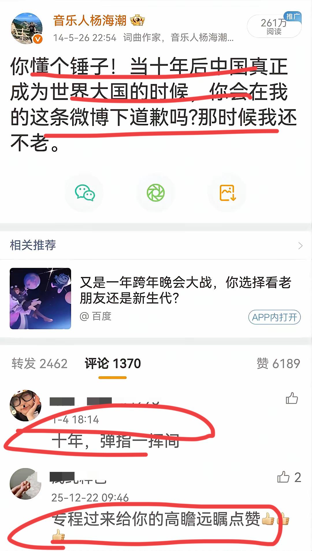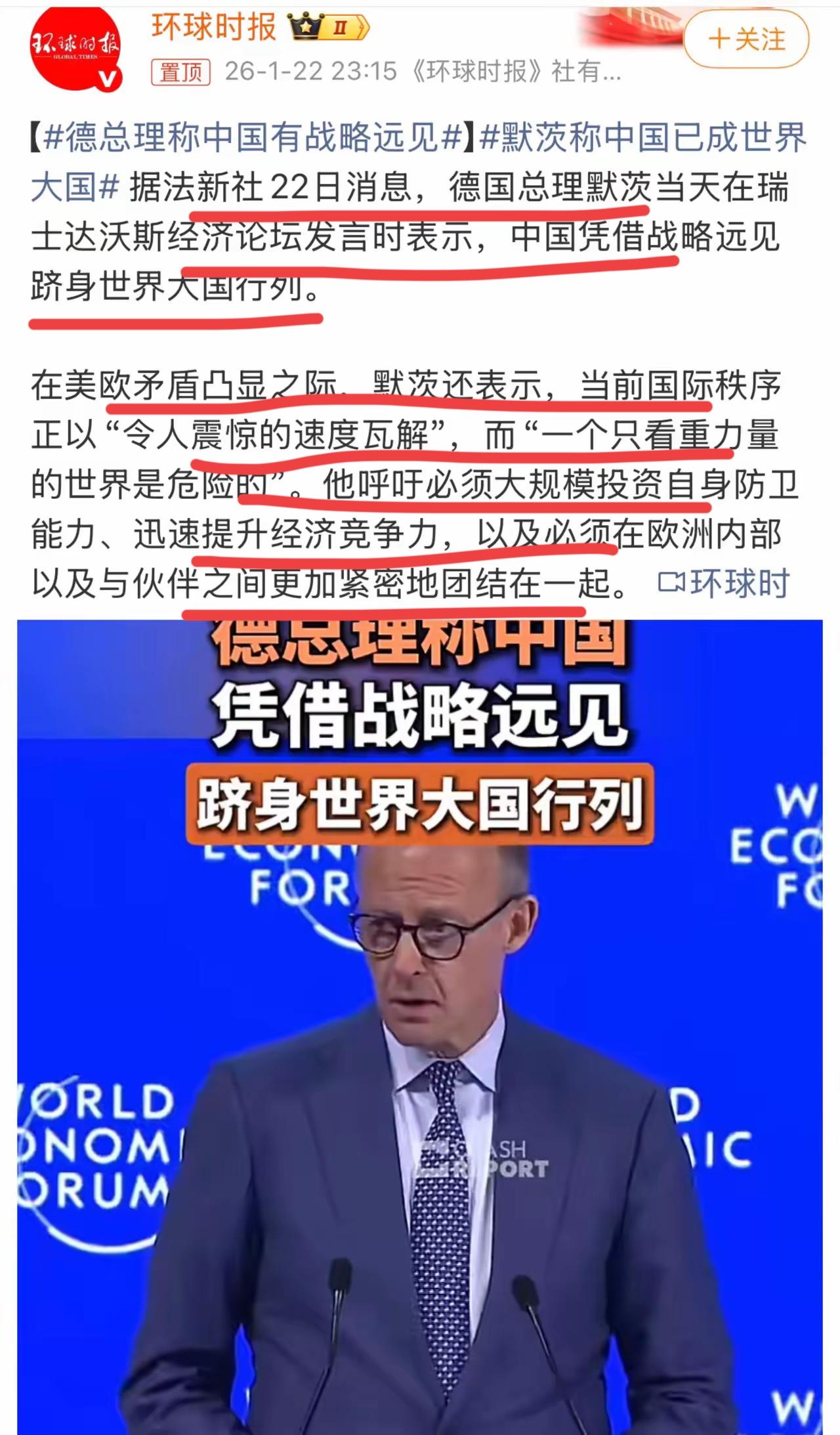太棒了!厉害了,我的国! 2026年,我们终于成为世界大国,世界强国,可喜可贺!! 德国总理在达沃斯论坛表示,中国凭借超强的战略远见,已经理所当然地成为世界大国! 个人觉得,这个描述还是太谨慎,应该说,凭借超强的战略定力和远见,成为世界强国~旧秩序在瓦解,新秩序在建立~ 提升经济能力,提高防卫能力,更加紧密团结起来,对抗某一个只看重力量的势力! 有网友十年前就预测到了今天!太牛了! 看看吧,专家,公知还不如一个音乐人,他们太没有自信了,该不该向音乐人道个歉么,大国崛起,所向披靡,势如破竹,加油!