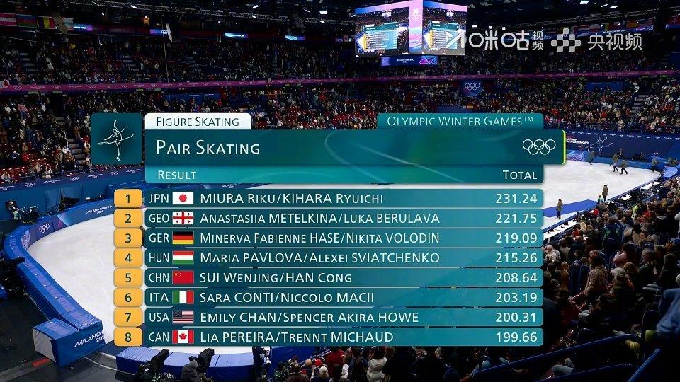 日本终结了中国双人滑的霸主地位! 在刚刚结束的米兰冬奥会双人滑决赛中,日本组合三浦璃来/木原龙一以231.24分的绝对优势夺冠,不仅创造了日本花滑的历史,也终结了中国队在该项目上的统治力。 这对组合自2019年搭档以来,进步神速,从北京冬奥会的第7名一路逆袭至米兰冬奥会的冠军。 他们以高难度的单臂托举和极快的滑行速度著称,自由滑《角斗士》的表演极具力量感,技术分高达82.73分,远超其他对手。 这是日本花滑历史上首枚双人滑奥运金牌,也是自2018年平昌冬奥会(羽生结弦)后,日本队时隔8年再次在花滑项目上夺金 。 作为卫冕冠军,隋文静/韩聪复出参赛,最终以208.64分获得第5名。 由于北京冬奥会后长期休战,两人在技术动作的稳定性和体能上有所下滑,短节目和自由滑均出现了单跳失误,导致技术分被拉开差距 。 随着这对功勋组合的谢幕,中国双人滑正面临严重的人才断档,年轻选手目前尚不具备冲击世界顶级赛场的实力,未来一个周期可能将进入“阵痛期” 。
