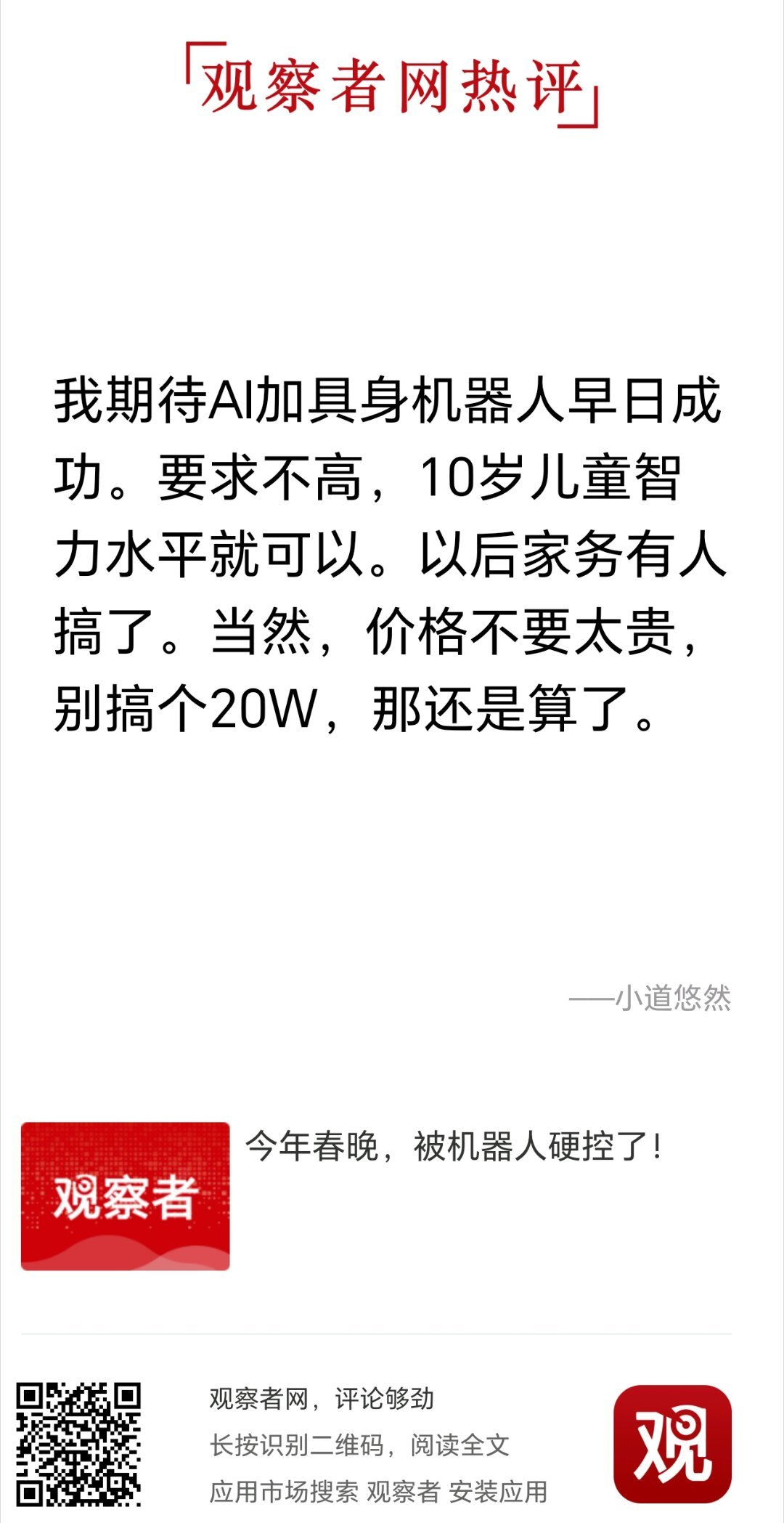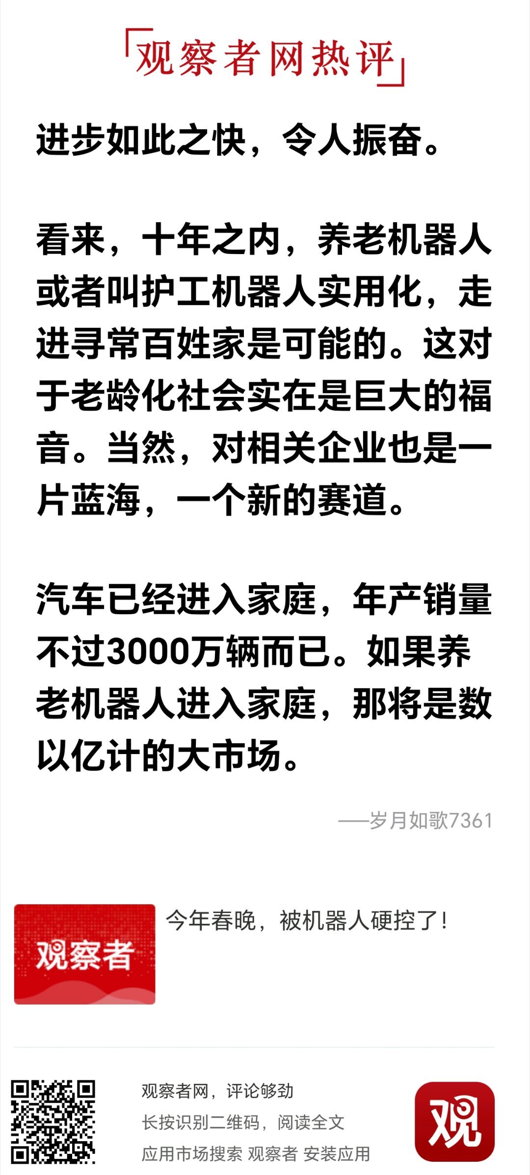 有网友称,看来,十年之内,养老机器人或者叫护工机器人实用化,走进寻常百姓家是可能的。这对于老龄化社会实在是巨大的福音。当然,对相关企业也是一片蓝海,一个新的赛道。