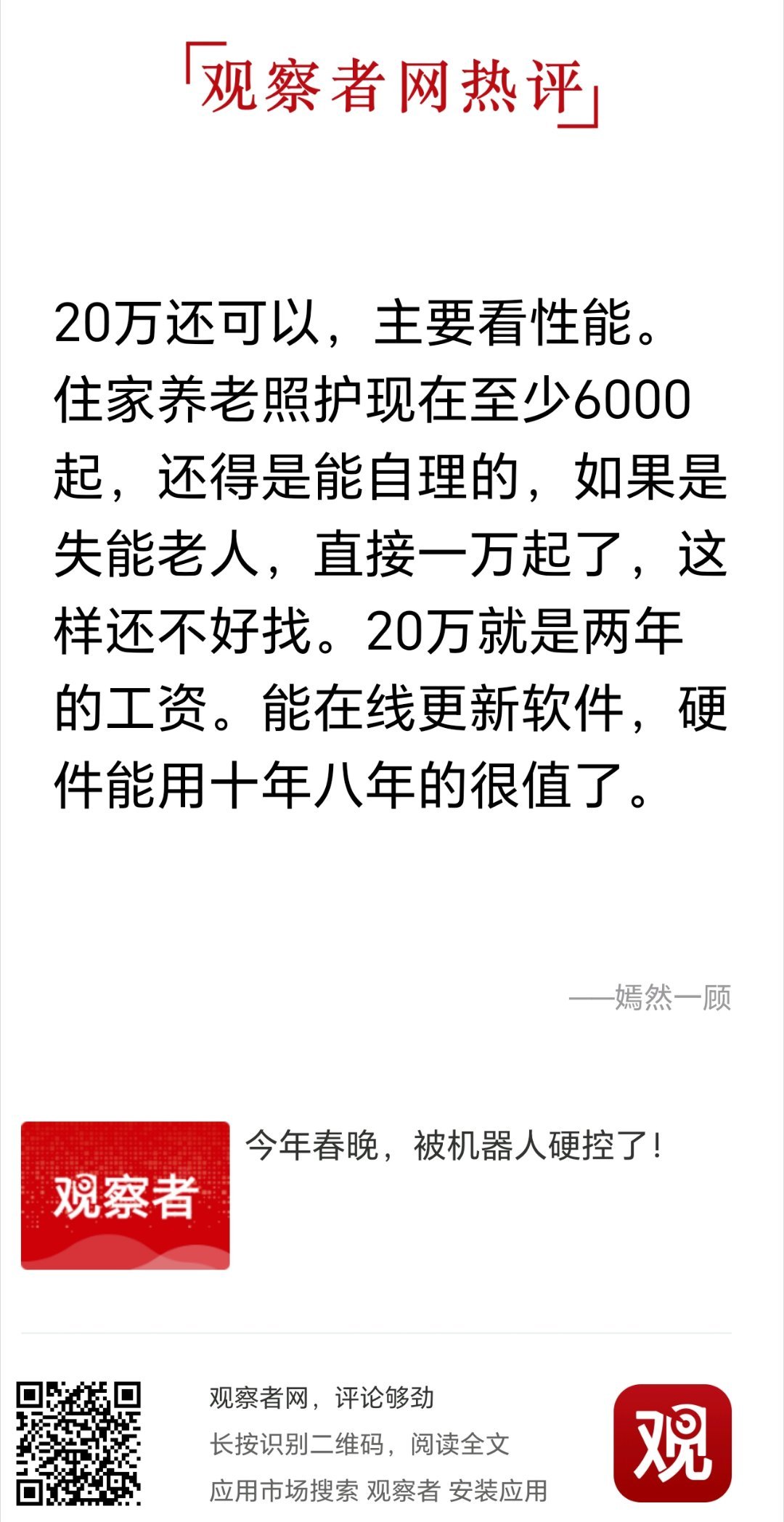 汽车已经进入家庭,年产销量不过3000万辆而已。如果养老机器人进入家庭,那将是数以亿计的大市场。#宇树科技股票##张万森 下机器人了#
