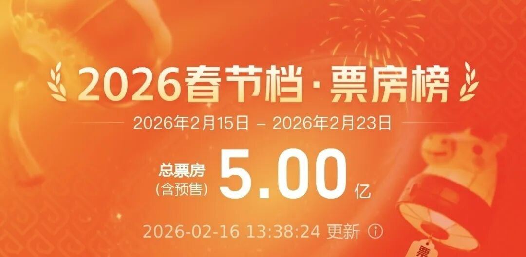 据网络平台数据,截至16日13点38分,2026年春节档档期总票房破5亿元。