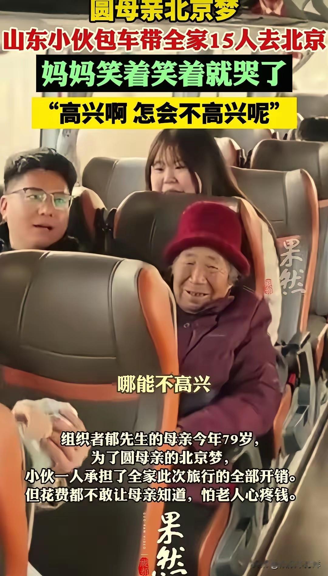 “太孝顺了!”山东临沂,一小伙回村过年,不走亲戚,不买年货,反倒干了件大事,他包车带着全家15口人去北京过年游玩5天!本以为老母亲会舍不得家、不愿出门,没想到老人凌晨6点就起床收拾东西。被问高不高兴时,母亲激动得抹着眼泪说:“高兴,哪能不喜欢呢!” 2026年春节,山东临沂这位小伙的过年方式,在网上引发大量讨论。他没有按照传统习俗走亲访友,也没有大量购置年货,而是自费包车,带着全家15口人前往北京旅游过年。 小伙的母亲今年79岁,一辈子没有出过远门,年轻时就一直想去北京看看。老人平时生活节俭,总怕给孩子增加经济负担,多次拒绝外出。小伙把母亲的心愿记在心里,用自己多年的积蓄完成了这次旅行。 出行前,村里有不少人不理解。有人觉得过年就应该待在家里,有人认为花费太高过于铺张。小伙没有过多辩解,他觉得,团圆的形式可以变,陪伴家人最重要。 老人当天凌晨六点就起床收拾行李,对这次出行充满期待。到达北京后,老人看到天安门等景点,情绪十分激动,多次落泪。老人说,这是自己过得最难忘的一个春节。 这件事,也反映出当代人过年方式的变化。越来越多的年轻人,不再局限于在家过年,而是用旅行、陪伴等方式,让亲情更有意义。 传统年味在改变,但团圆的核心没有变。孝顺不一定是花多少钱,而是及时陪伴,帮长辈完成未了的心愿。 现在很多人常年在外工作,陪伴父母的时间很少。很多事情不及时去做,将来可能只剩下遗憾。这位小伙用实际行动告诉大家,尽孝要趁早。 此事在网络上形成两种观点。支持者认为,花自己的钱圆家人的梦,是真正的孝顺。反对者则认为,过年应居家团圆,外出旅行过于折腾。 每个家庭的情况不同,只要家人平安快乐,就是最好的新年。 你支持这位小伙的做法吗?你觉得带全家外出过年,是孝顺还是铺张?