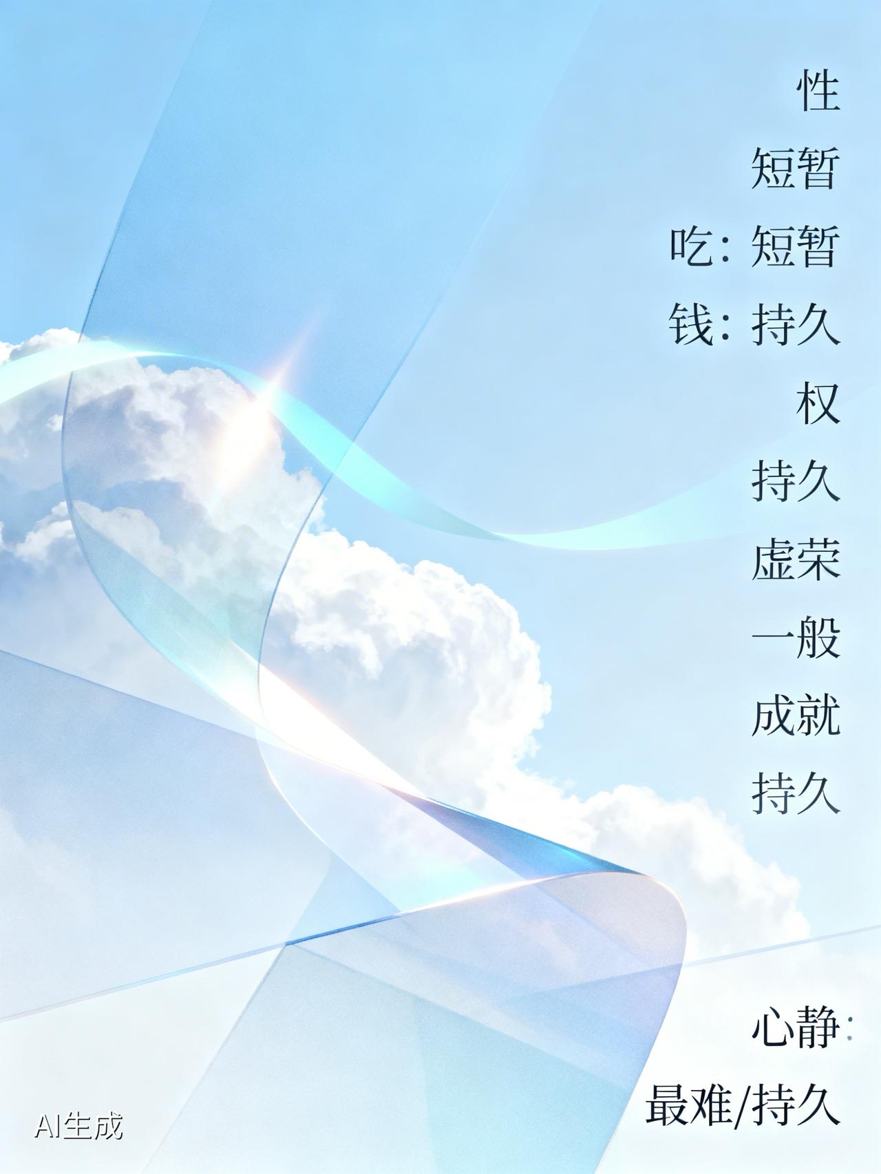 一段非常通透的话: 人类的七大快乐源泉: 1、性:这是最容易的,也是最短暂的快乐。 2、吃:这个也很容易,快乐也是短暂的。 3、钱:这个比较难,快乐也持久,而且钱可以买到很多人间快乐。 4、权:这个非常难,这种掌控的快乐也是持久的。 5、虚荣:这是精神层面的满足和被认同,快乐持久度一般。 6、成就:这是更高层次的精神满足,和被尊重,快乐是持久的。 7、心静:这是最难得到的,也是最持久最健康的快乐。心安,心定,心平气和,淡淡的喜悦是人世间最难得的快乐。 人到中年,你有没有这样的感觉:年轻时拼命追求的东西,现在好像没那么重要了。性、吃、钱、权,这些曾经的快乐,如今味道淡了。 不是这些东西不好,而是你的味觉变了。年轻时饿,一顿饱饭就幸福;中年后饱,山珍海味也平常。不是快乐少了,是你需要的层次高了。 多少人前半生为钱权奋斗,以为有了这些就能幸福。可真有了,却发现焦虑更多。 虚荣和成就确实能带来满足,但依赖别人认可,快乐不稳。 中年后才明白,最高级的快乐是心静。那种淡淡的喜悦,不依赖任何外物。 今晚问问自己:快乐在第几层?如果为钱权焦虑,放下手机十分钟。