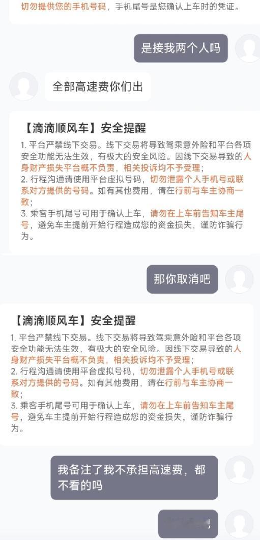 真的太无语了,打顺风车真的能遇到这种事!我明明在平台备注了不承担高速费,结果车主接单后,不仅想再接其他人,还要求我们两个人出全部高速费,说只接我们俩没得赚。我本来以为是独享的顺风车,沟通后谈不拢,让他取消订单他也不吭声,最后没办法只能退了单坐高铁回去。不想接这种备注的单子可以直接不接啊,何必浪费彼此的时间,真的太闹心了!