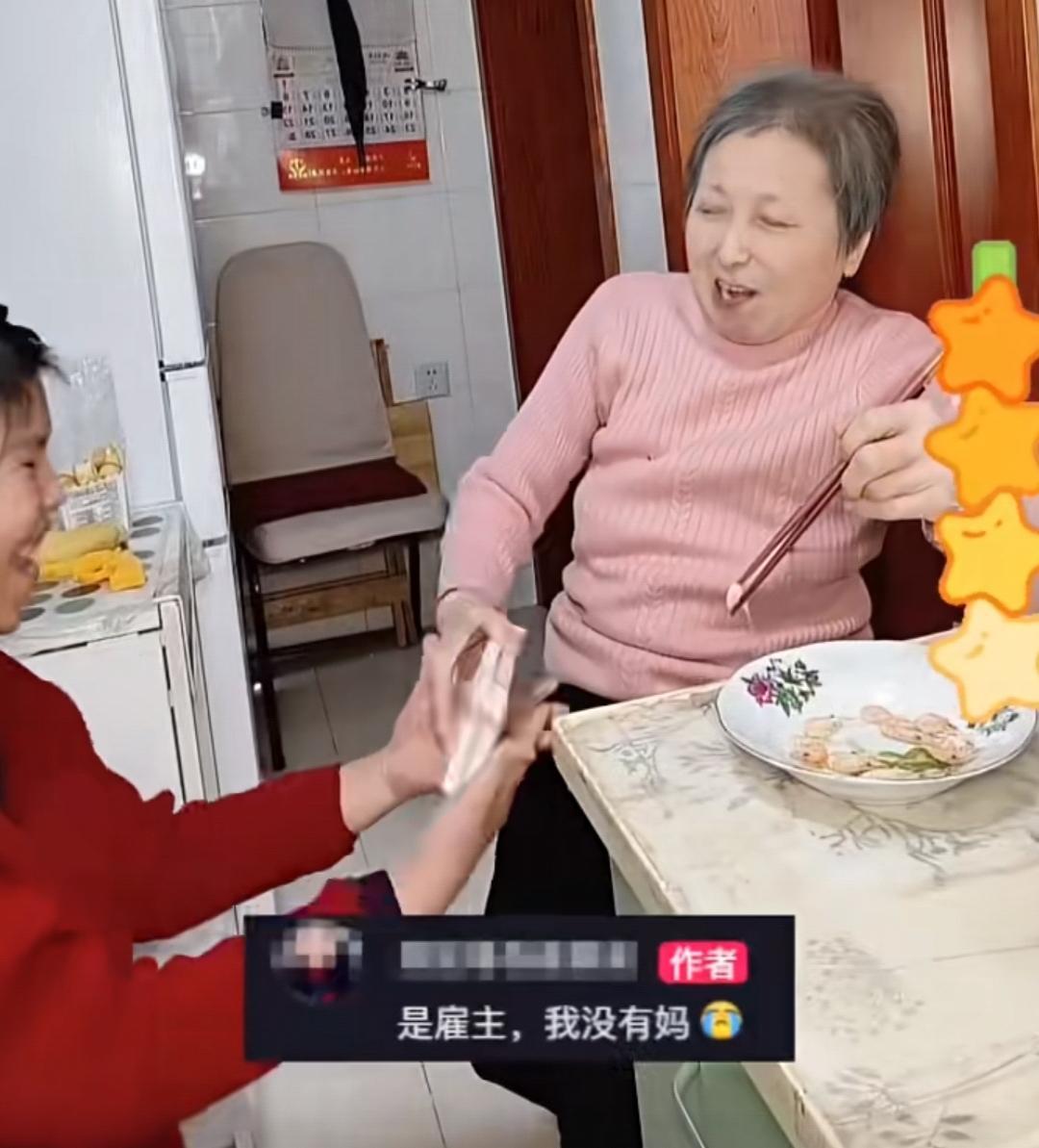 上海一保姆给雇主磕头获得两万元被网友质疑是“亲妈”,当事人称母亲已经去世,确实是雇主,每年都是两万元!网友:“我该朝那边磕头?” 2月15日,上海一保姆给雇主老太太磕头拜年,还模仿吉祥物给雇主送祝福语,将雇主哄得仰头大笑,随即又像个孩子一般伸手向雇主讨要红包,丝毫没有老板与员工之间的距离感。 视频发出后,看视频中两人的相处,完全不像是主雇地冠希,于是有网友发问:“这人是亲妈吧!” 对此,当事人回应:“我没有妈了,确实是雇主。” 雇主一边吃着饭一边将提前准备好的两万块钱递给保姆,没想到保姆竟然随手就从旁边拿了个垫子就开始磕头拜年,这一举动将雇主老太太吓了一大跳,随即哈哈大笑起来。 当事人说:“每年都是两万块钱。”看来主雇二人已经相处了好几年了,并且相处得非常不错。 或许她们的主雇关系在平日一点一滴的相处之中早已经升华成了亲人一般的关系,在保姆像个孩子一样磕头拜年时,雇主已经成为了长辈,从她宠溺地眼神中就可以看出,她也把保姆当成了自己的孩子来看待。主雇之间的关系可真让人羡慕啊!
