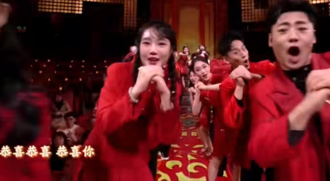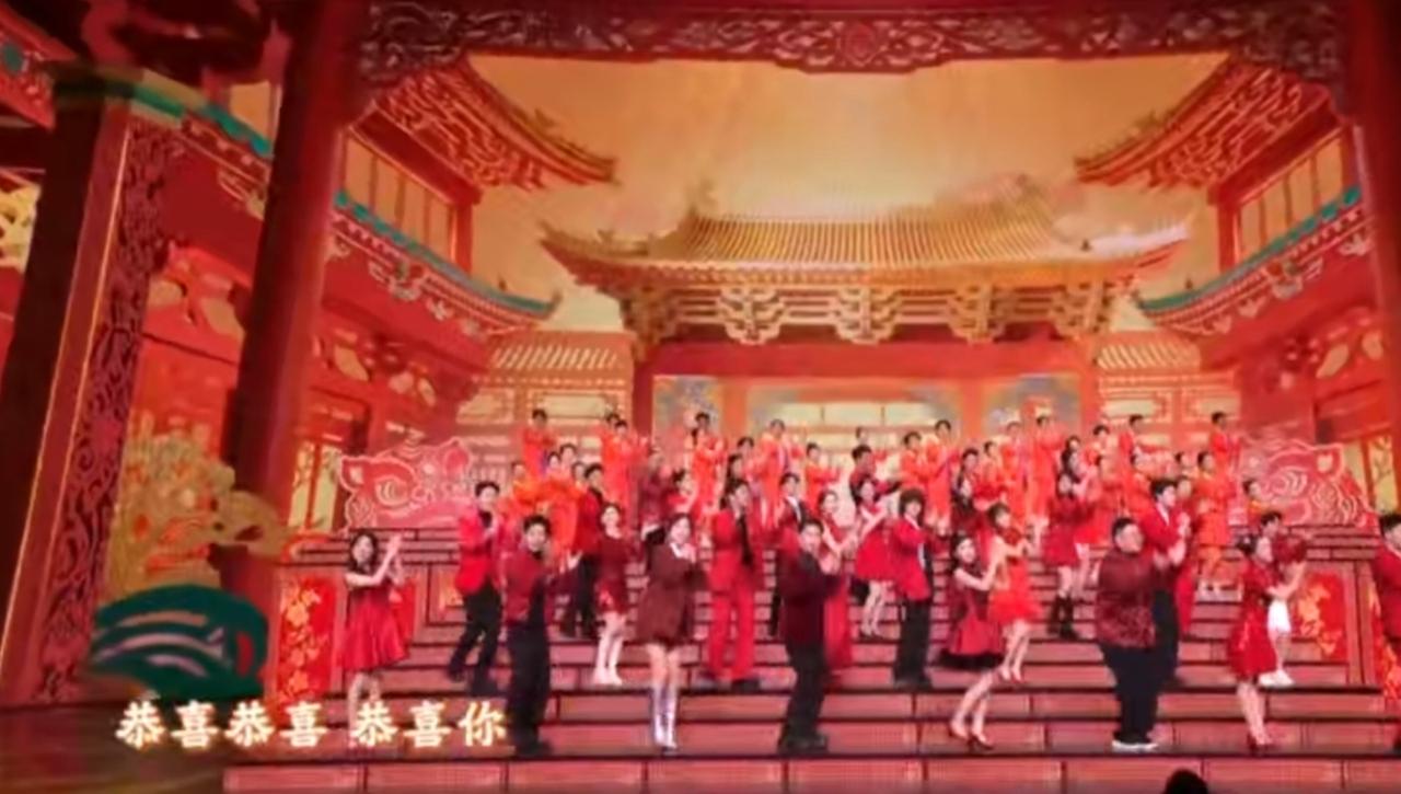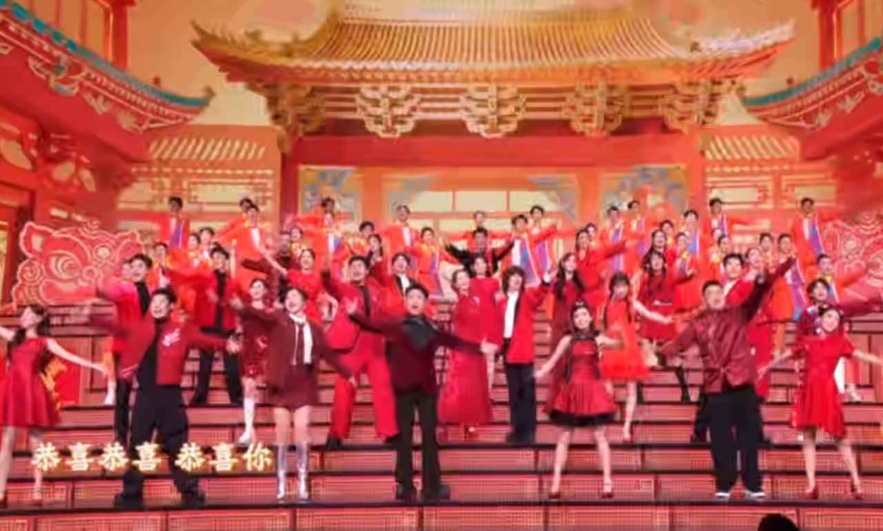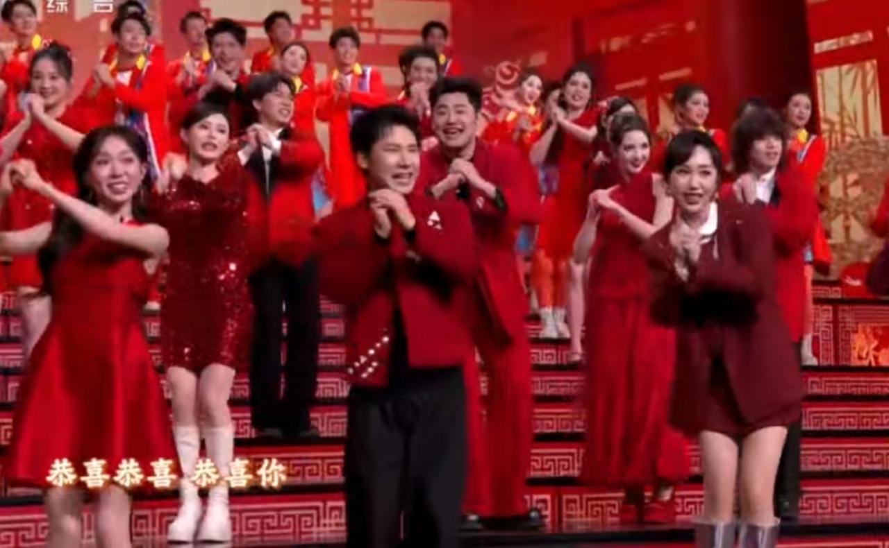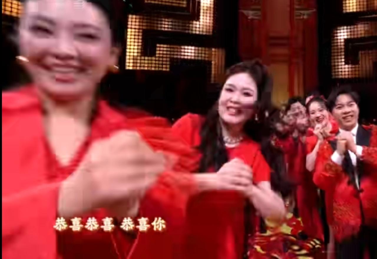 演员们身着各式红装,或亮片闪耀,或简约大气,齐齐拱手作揖,笑意漾在眉梢。熟悉的《恭喜恭喜》旋律响起,大家齐声欢唱,时而舒展双臂,时而并肩高歌,每一个动作都充满活力,每一句歌词都饱含祝福。“你勤劳生活美,你健康春常在”,质朴的唱词里,藏着对平凡日子的期许,对家国安康的祈愿。