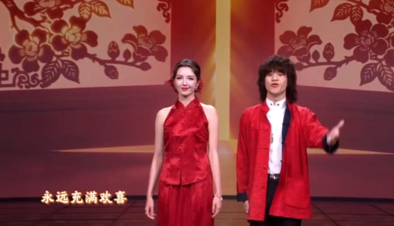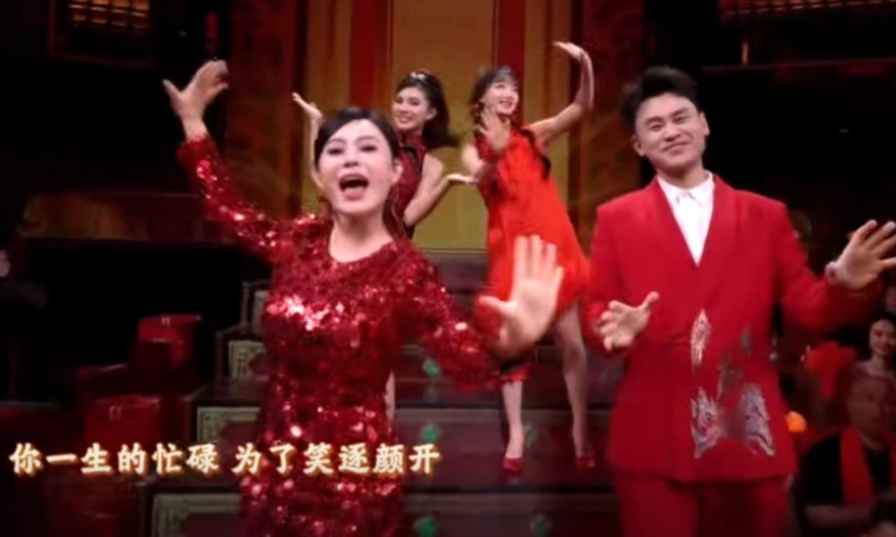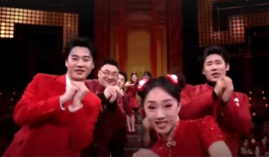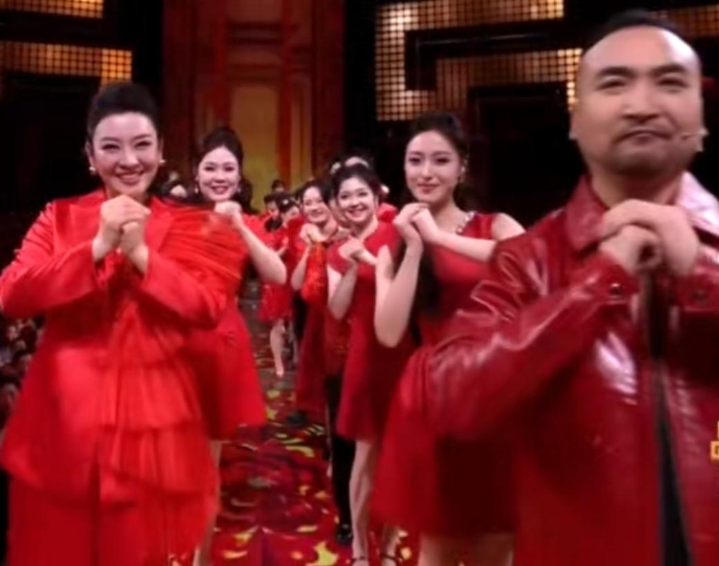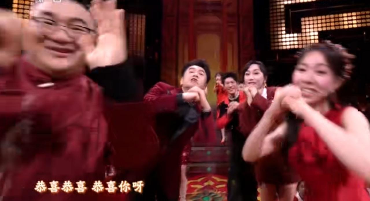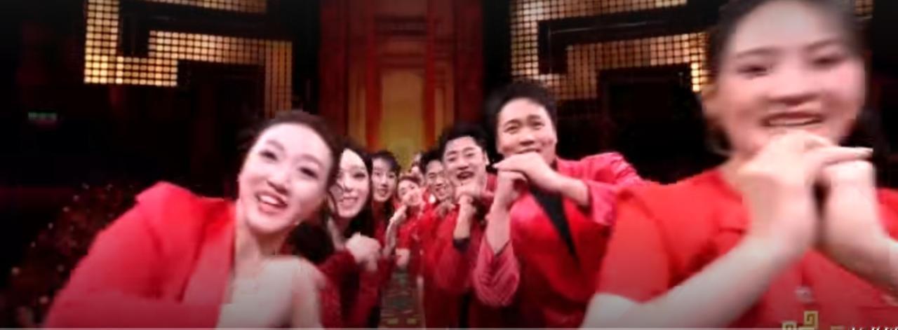 演员们身着各式红装,或亮片闪耀,或简约大气,齐齐拱手作揖,笑意漾在眉梢。熟悉的《恭喜恭喜》旋律响起,大家齐声欢唱,时而舒展双臂,时而并肩高歌,每一个动作都充满活力,每一句歌词都饱含祝福。“你勤劳生活美,你健康春常在”,质朴的唱词里,藏着对平凡日子的期许,对家国安康的祈愿。