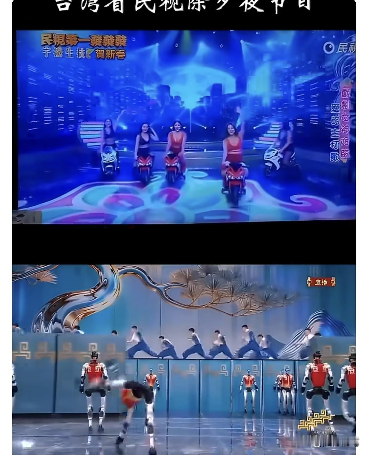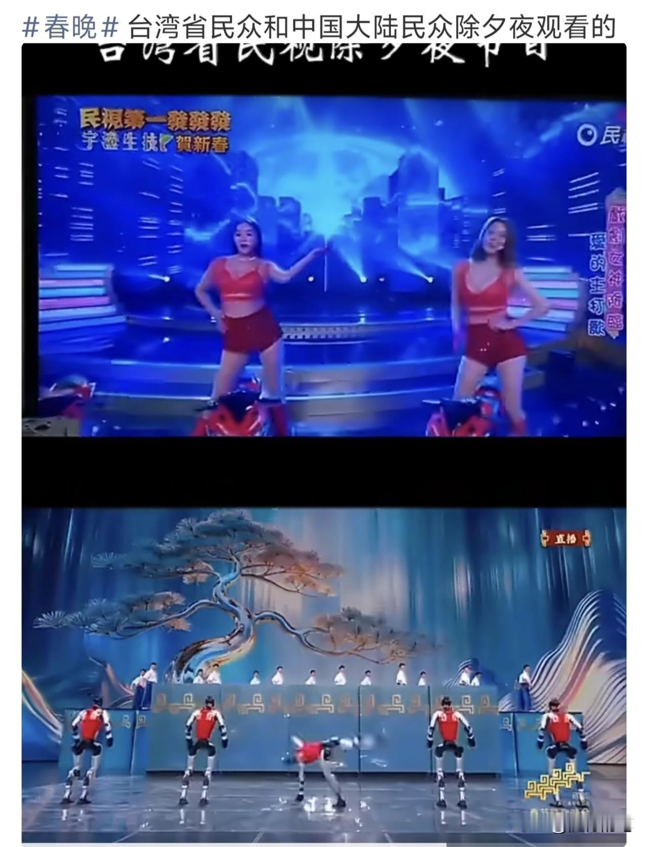 看到没?两岸春晚对比,不看不知道,一看就知道差距有多大。 大陆春晚既有最先进的科技融合,也有赏心悦目的民族特色,既有家国情怀,也包含小家温馨,既突显开放包容,也强调民族齐齐整整。 而台湾这种除夕节目,不知道的还以为是八九十年代的歌舞厅的风格,既低俗又毫无新意,而且还特地邀请日本人来参与其中节目,既落伍又媚日。 无论从节目的深度和广度,还是从风格的多样和包容,或者是格局,可以说全方位碾压岛内这种复古低俗的春晚。