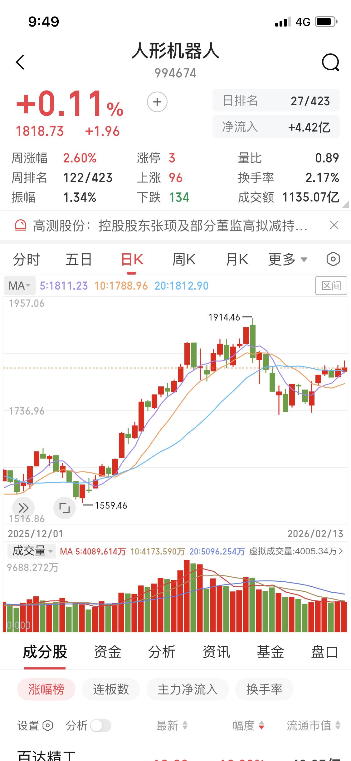 人形机器人年后或许真有上升趋势。2026年春晚,宇树等多家机器人企业集中亮相,大大提升了板块关注度。从短期看,春晚这个国民级事件容易吸引情绪资金入场,推动概念股“冲一波”。不过,这种上涨多由游资和散户情绪驱动,并非基本面支撑。像2026年1月28日至2月11日,机器人概念板块主力净流出超12亿,很多公司靠蹭热点,机器人业务占比不足5%,反弹可能是“脉冲式”的。从中期看,板块反弹得靠政策与业绩支撑,国家已将具身智能列为重点产业,有真实订单和技术的企业更可能持续受益。