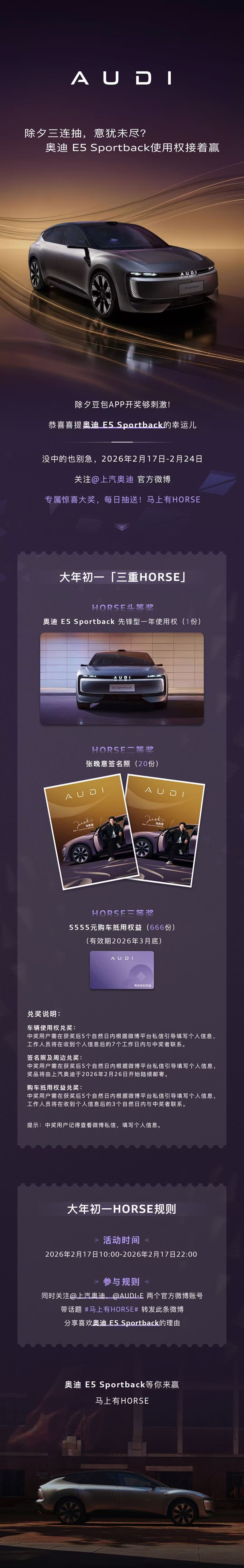 全网催更,官方不玩虚的——关注官方微博动作,初一到初八,天天有重磅上新加场!三冠王实力,这波不冲,等什么呢!!! 奥迪抽奖送车除夕福利返场