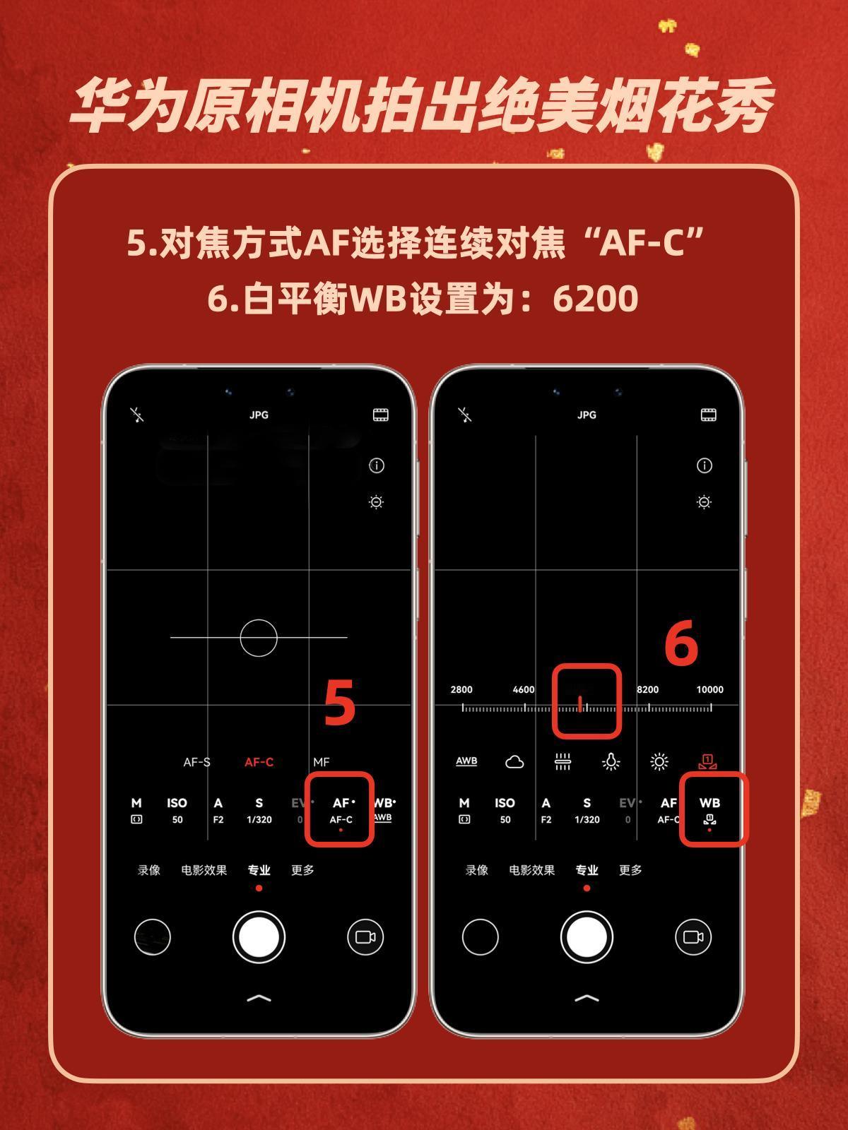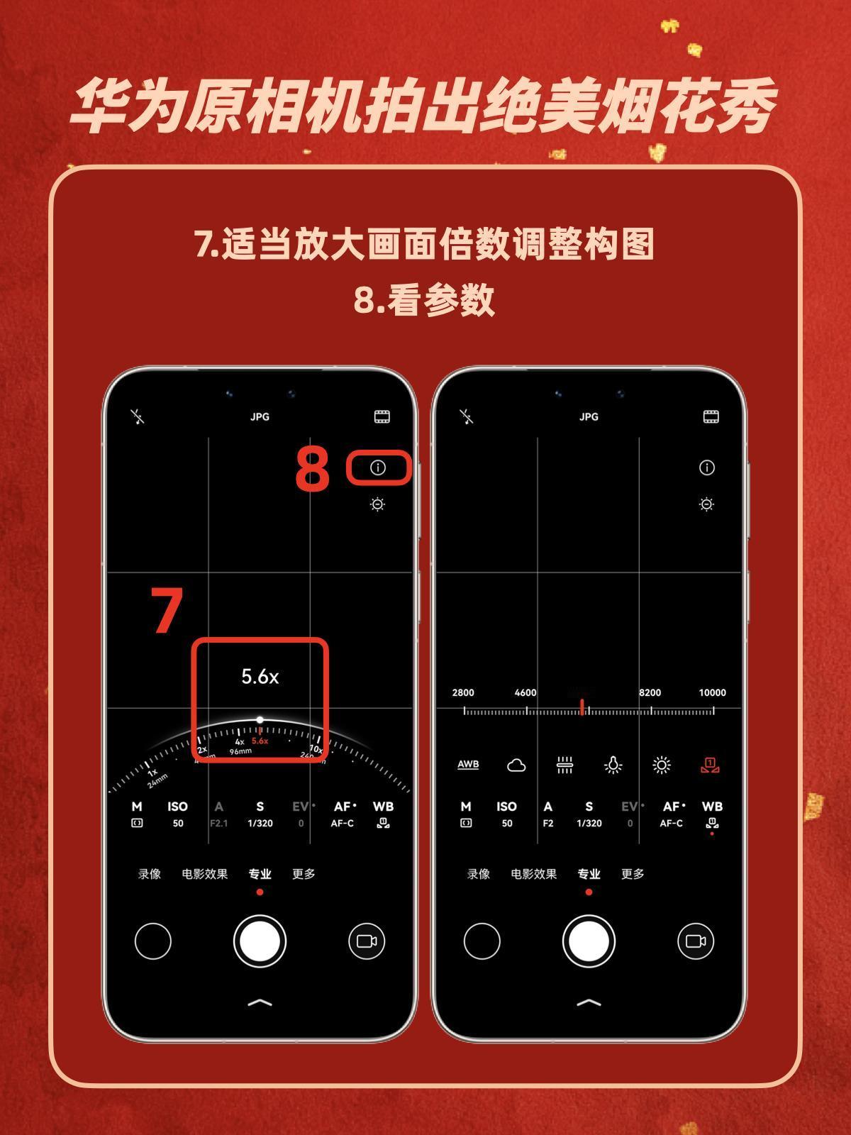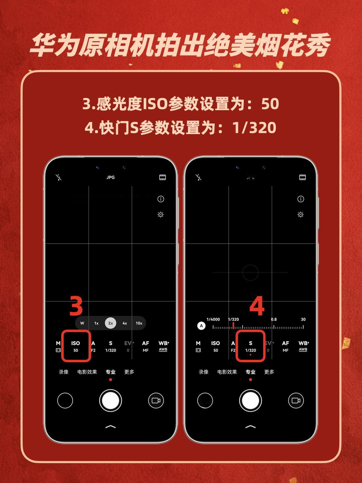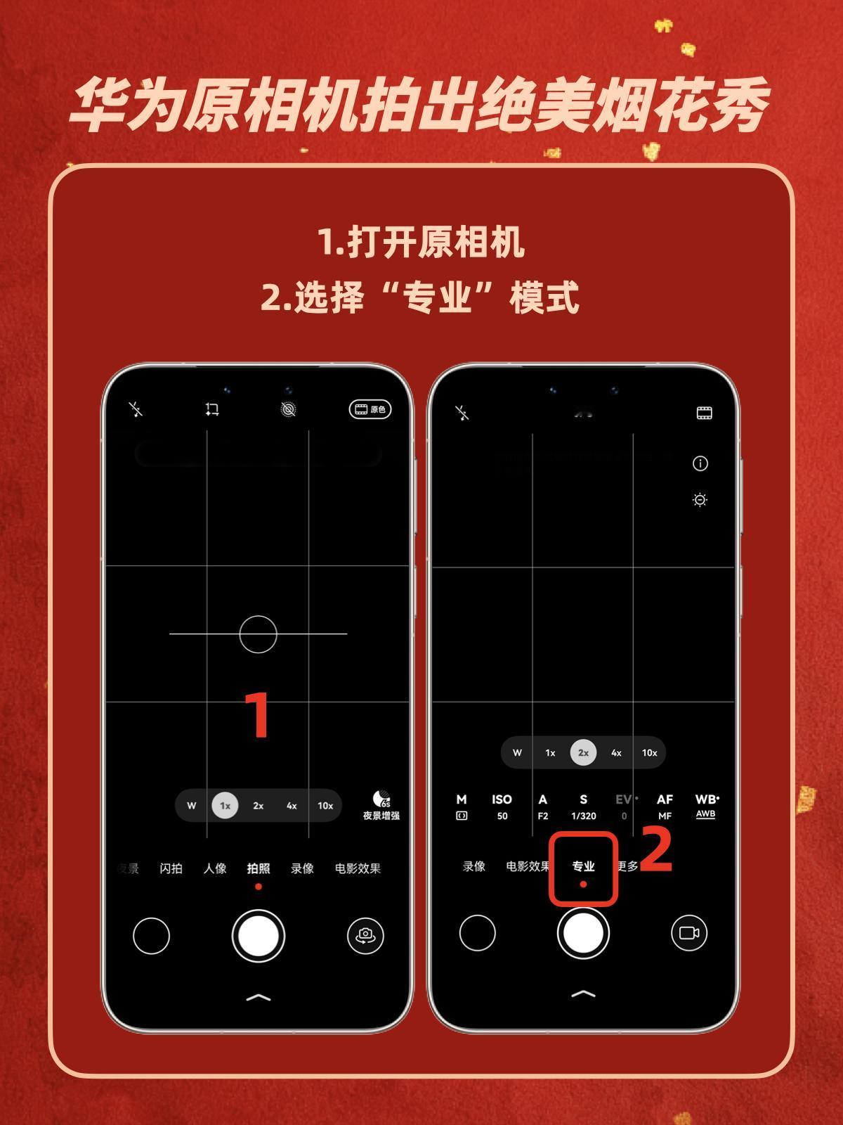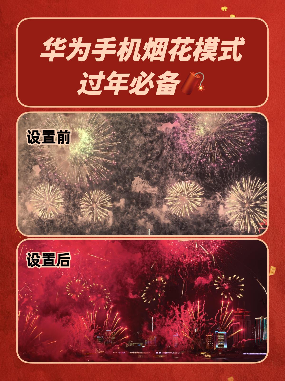 华为烟花模式封神了🎆新手零翻车 😓之前跨年拍烟花,华为手机拍出来不是糊成光斑,就是暗得没细节,现场超震撼的烟花,照片里全是“买家秀”!摸索了好几次,终于搞懂华为手机自带的烟花模式,拍烟花贼丝滑📷小白也可以随手get 保姆级步骤奉上,跟着调就行👇 ❶ 点开原相机 ❷ 右滑到【专业】模式 ❸ 点ISO图标,拉到50(画面立刻变干净!) ❹ 快门S调成1/320(抓住烟花炸开瞬间) ❺ 对焦选AF-C(自动追着烟花跑) ❻ 白平衡调到6200左右(冷色调更高级) ❼ 双指放大1.5-2倍(避开杂乱人群) 重点来了!一定要用三脚架或者靠栏杆稳住! 我的手抖星人亲测按这组参数手持也能拍! 亲测有效!建议收藏这个参数模板,过年拍烟花、演唱会拍灯光都👌