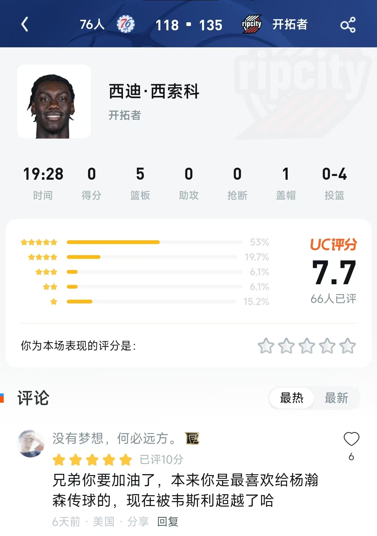 2026年2月10日,开拓者主场以135-118大胜76人,迎来三连胜 。此役,开拓者全队7人得分上双,卡马拉轰下生涯新高的30分,阿夫迪亚砍下准三双 。在这样一场进攻盛宴中,有一个人的数据显得格外“扎眼”:出战19分钟,得分挂零,投篮4中0。