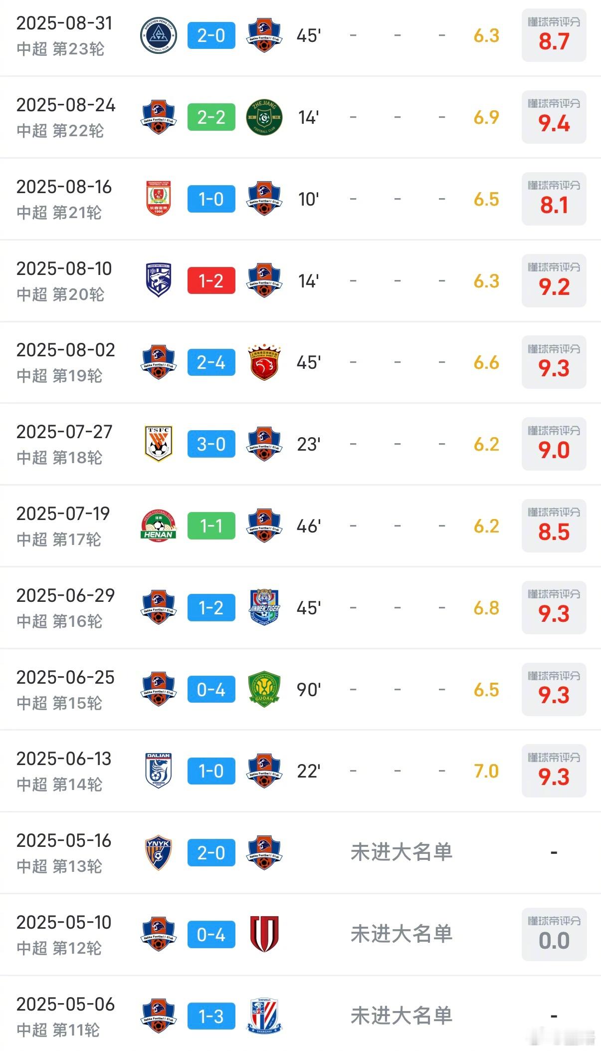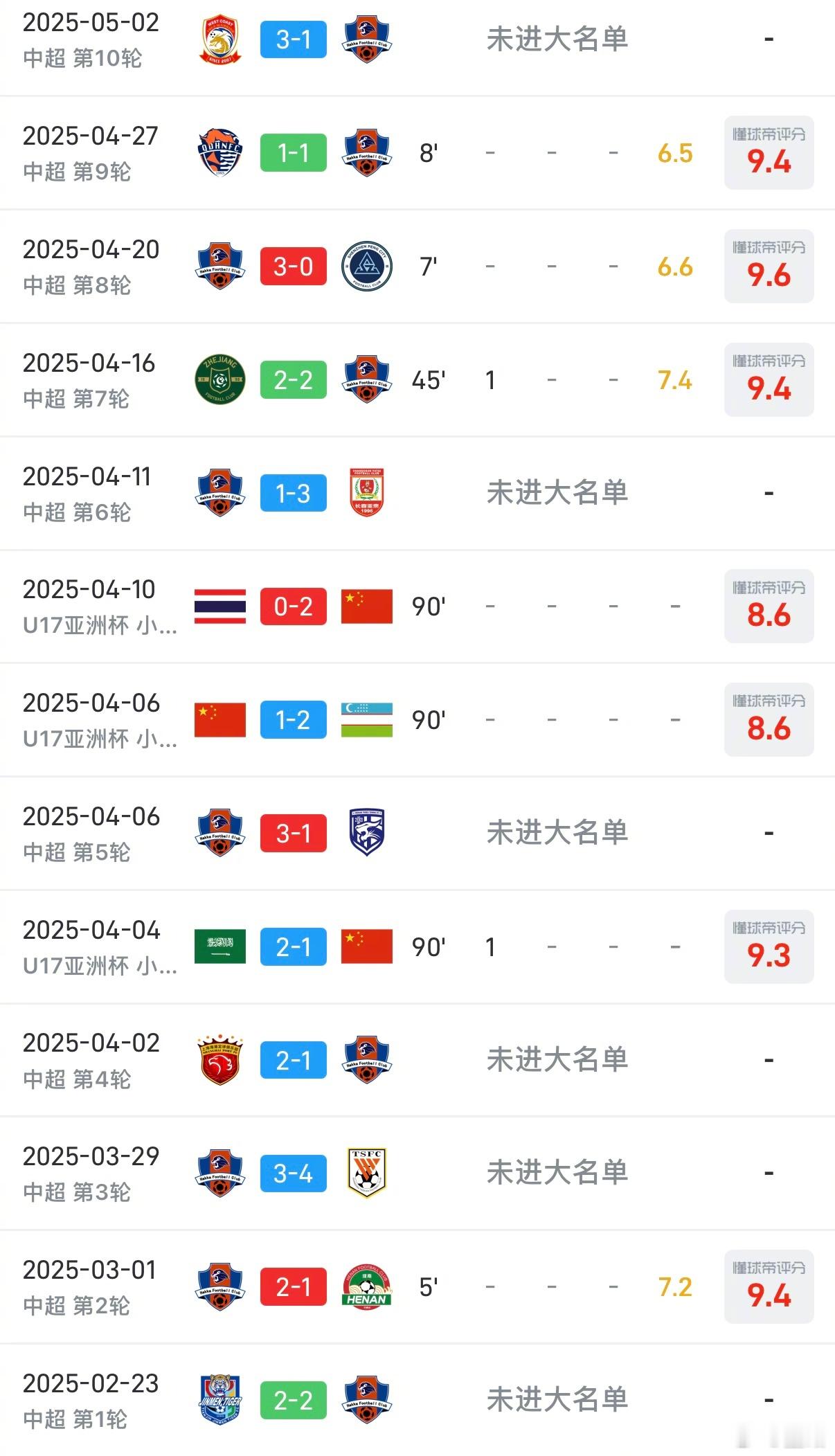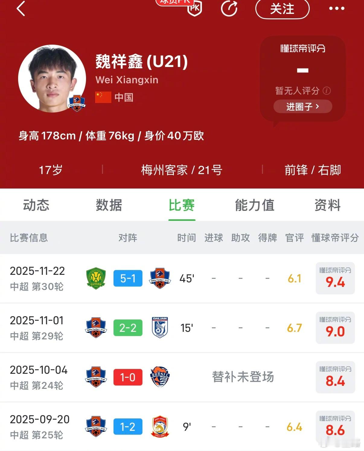 魏祥鑫去年中超出场记录——前10轮,6次未进大名单,替补出场4次,出场时间:5、7、8、45分钟……需要耐心!