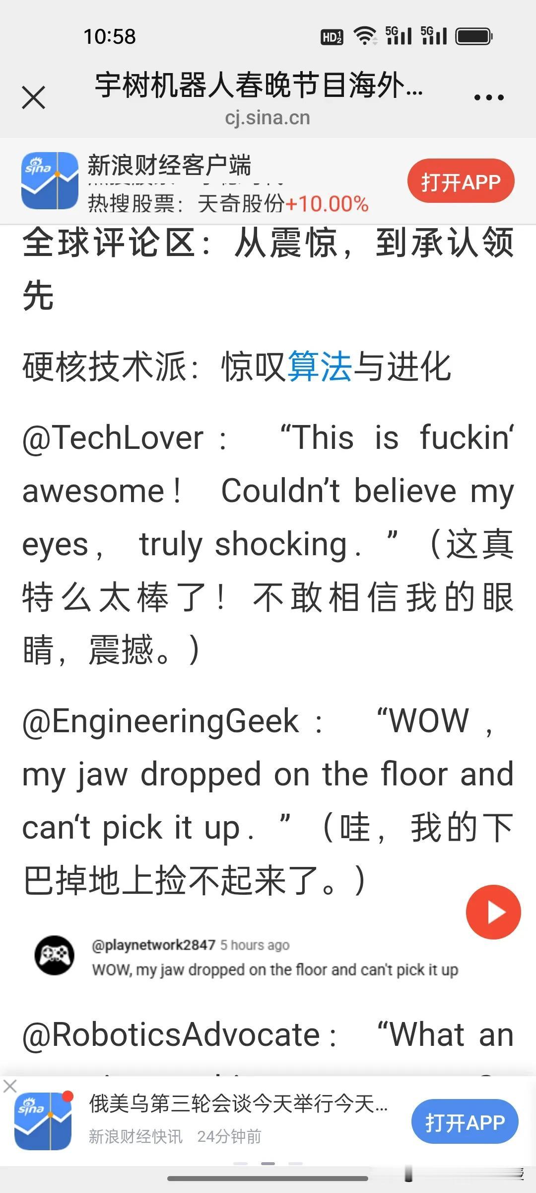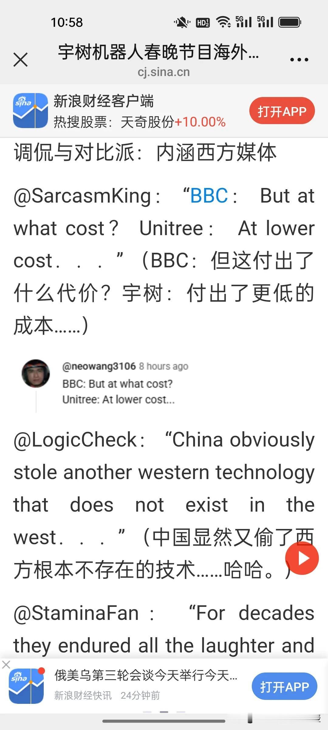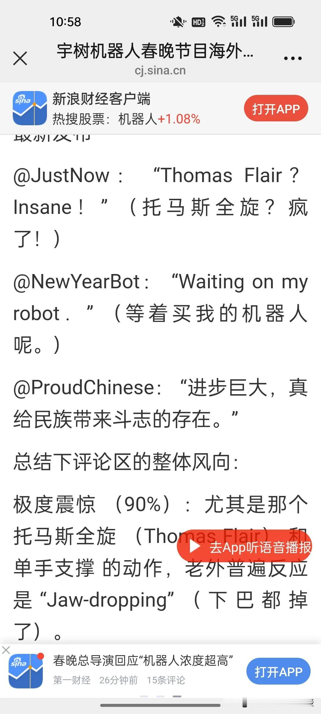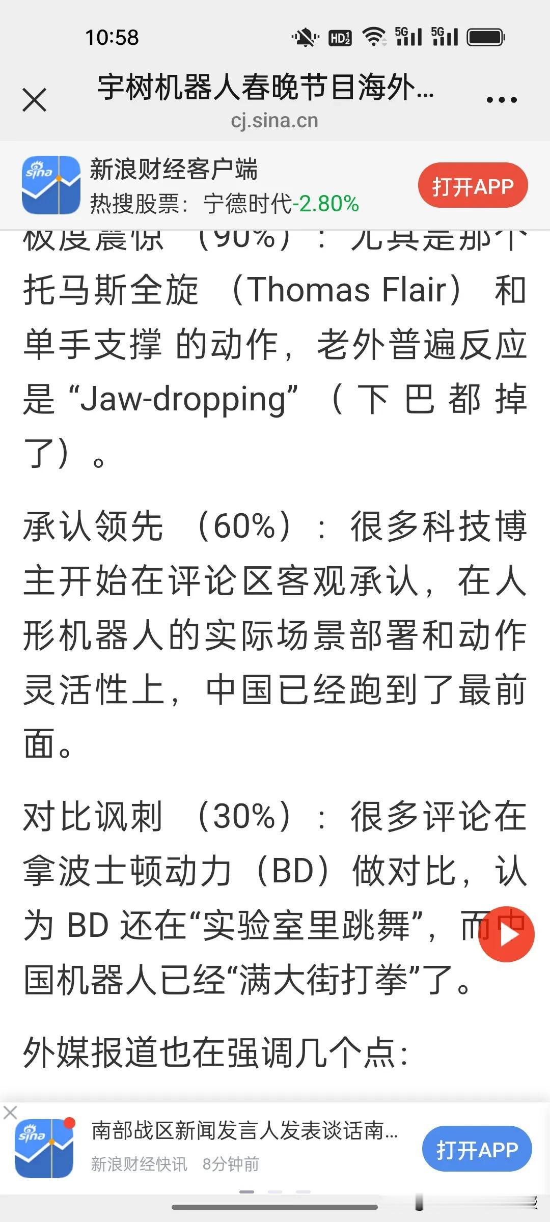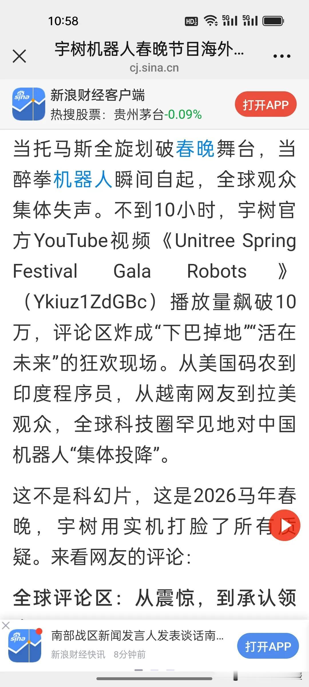 路透社:中国机器人在全球已经是主导地位。全世界对春晚宇树机器人的表演都给予极高的评价! 刚刚看到《环球市场播报》一句外国网友对春晚宇树机器人托马斯全旋的震撼评价:全球科技圈罕见地对中国机器人“集体投降”。这不是夸张,而是全世界爱好科技的人和所有码农的一致赞叹。他们拿美国波士顿动力作为对比,被调侃那个机器人只能在实验室里跳舞,宇树机器人已经能称霸全世界了。 刚刚,路透社已经发布了题为《人形机器人在中国春晚大放异彩》的报道,重点关注了宇树机器人表演的醉拳、舞剑等复杂动作,并援引数据指出中国在全球人形机器人市场的主导地位。已经不止是领先了。 还有《今日印度》更是用“疯狂”惊呼宇树机器人在直播中展现的高平稳度。《美联社》报道宇树机器人是中国新科技名片。一向关注中国的CNN,目前还没发声,大概也在惊叹中写稿吧!