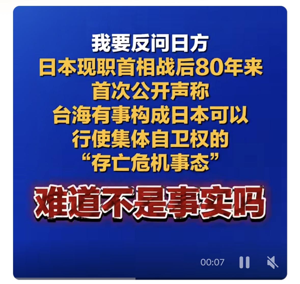 2月16日,中国驻日本使馆发言人严正驳回日方无理交涉,指出其言论歪曲事实、纯属狡辩,并连发三问:日本首相妄称台海有事即“存亡危机事态”、日方供奉甲级战犯、当年发动侵略战争,这些难道不是事实?