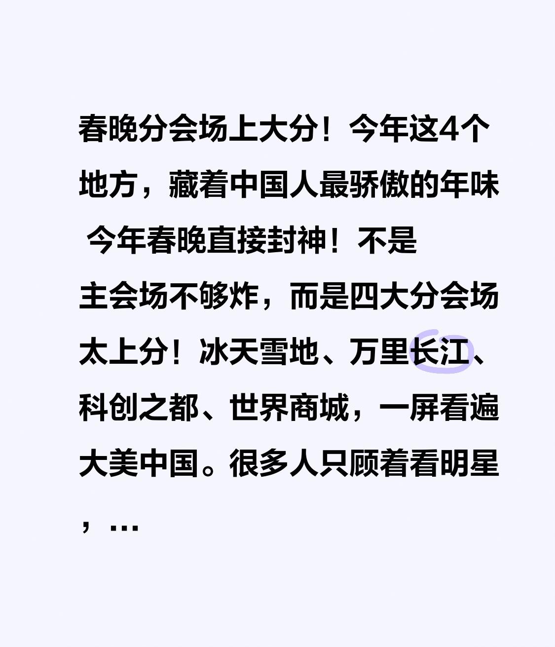 春晚分会场上大分!今年这4个地方,藏着中国人最骄傲的年味 今年春晚直接封神!不是主会场不够炸,而是四大分会场太上分!冰天雪地、万里长江、科创之都、世界商城,一屏看遍大美中国。很多人只顾着看明星,却没发现:分会场里藏的,才是最地道的中国年、最硬核的中国实力! 马年春晚一开播,全国观众都被惊艳到。北京主会场大气磅礴,而哈尔滨、义乌、合肥、宜宾四大分会场,各有各的王炸,把年味、民俗、科技、风光一次性拉满。 哈尔滨一出场,冰雪大世界变梦幻舞台,冰雕、芭蕾、交响乐、冬奥冠军同框,零下几十度的寒冷,挡不住东北人的热情好客。屏幕前的我们,隔着手机都能感受到那份滚烫的年味。 义乌用拨浪鼓摇出世界生意,中外歌手同台,小商品连接全球,小小摊位藏着大国气象,让全世界看到:中国年,就是世界年。 合肥把非遗黄梅戏和量子科技结合,古韵与现代碰撞,文气与科技齐飞;宜宾依长江而歌,川剧、打铁花、三江美景,一江清水向东流,尽展山河壮阔。 有人说,分会场只是换个地方唱歌跳舞。大错特错!今年春晚分会场,根本不是简单的舞台秀,而是中国大地的全景拜年。从北到南,从雪山到江海,从传统到未来,这是在告诉全世界:中国很大,很美,很拼,很暖。 它在告诉漂泊的人:无论你在北方守冰雪,在南方看长江,在城里搞科创,在市场闯天下,这里都有你的家乡,有你的根。 一桌春晚,九州同欢。主会场守的是家国团圆,分会场展的是山河壮阔。 我们看的不只是节目,是冰天雪地里的温暖,是市井烟火里的兴旺,是千年文脉里的传承,是大国崛起里的自信。 这才是春晚最动人的地方:一家人围坐,看万里江山,过团圆中国年。 愿我们的祖国,山河锦绣,繁荣昌盛;愿每个中国人,岁岁平安,年年圆满,马年大吉,万事顺意!