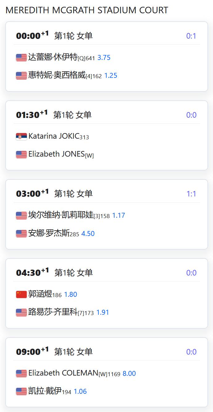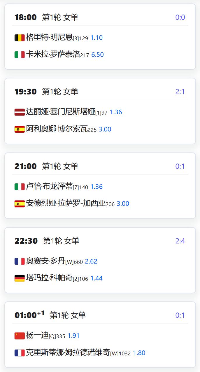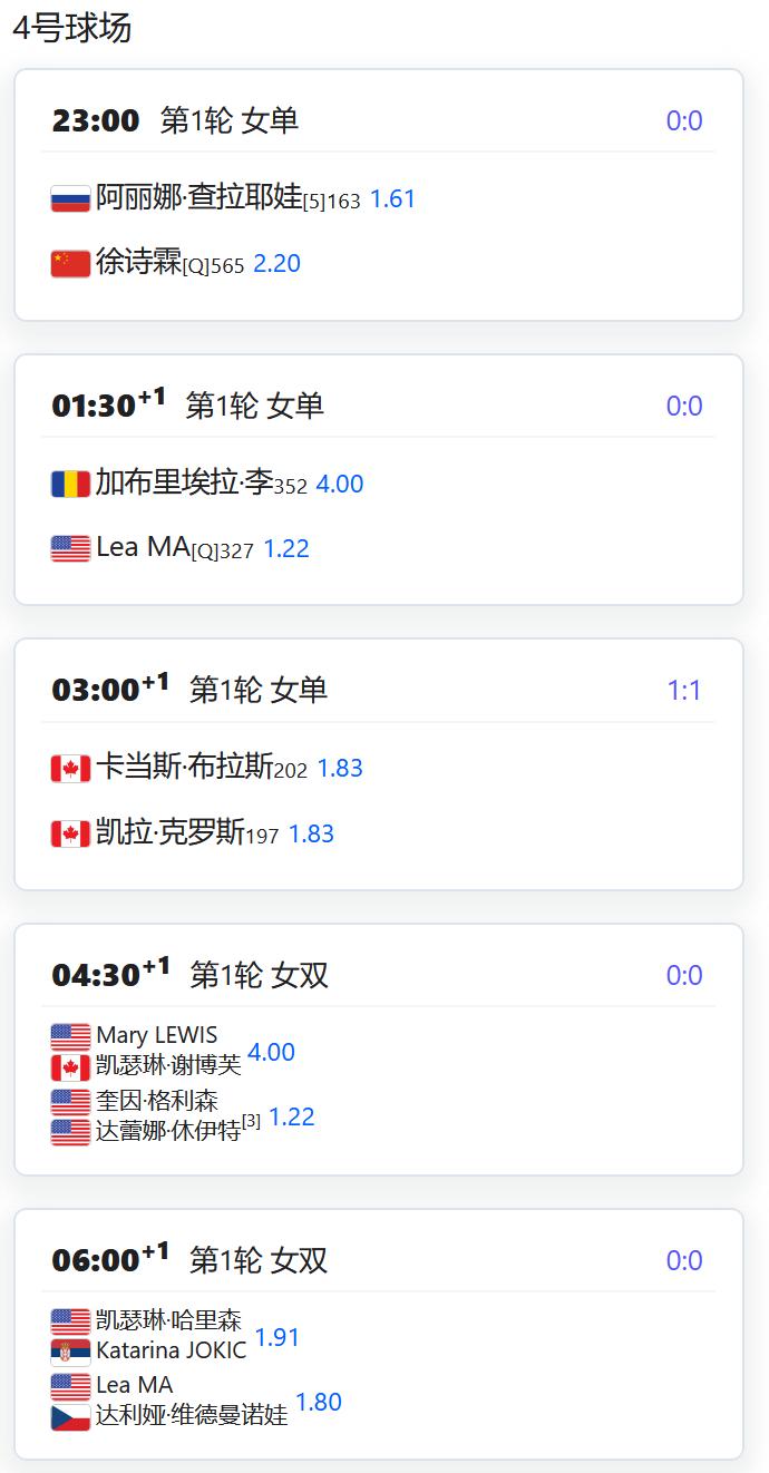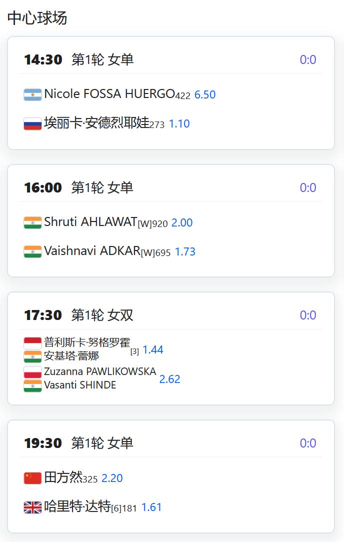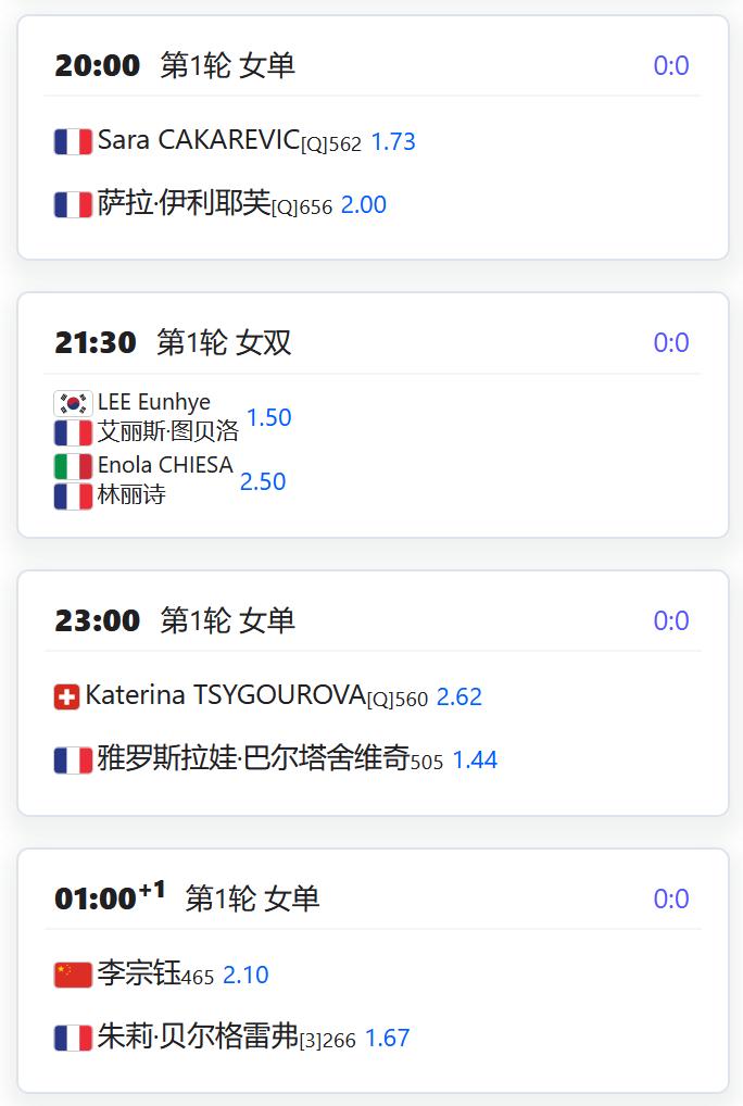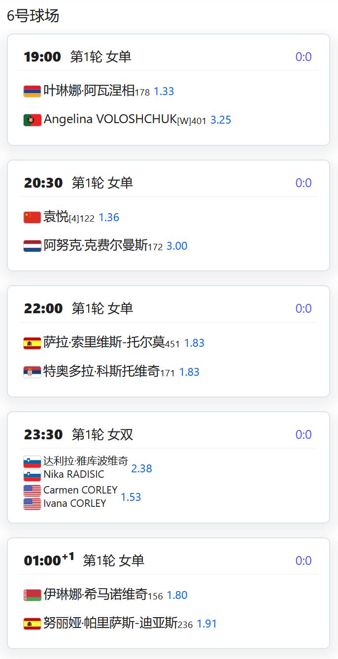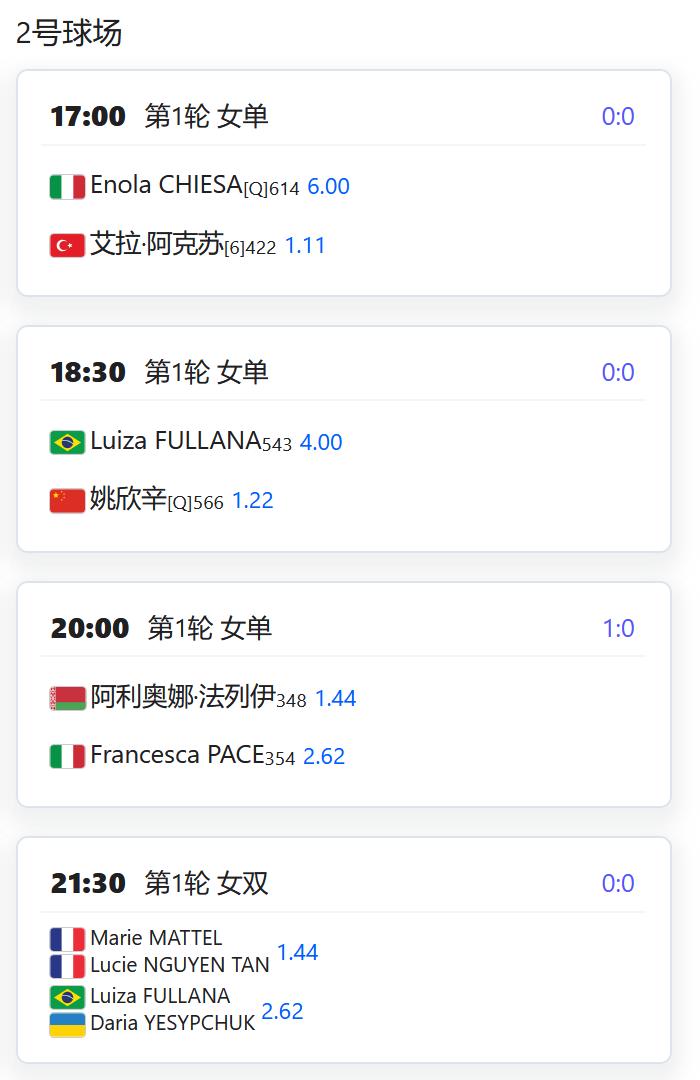 ATP500赛多哈站,男单第一轮,用保护排名出战的张之臻将对阵资格赛球员巴埃纳; WTA125 LES SABLES D'OLONNE,从资格赛突围的杨一迪将在女单第一轮对阵持外卡参赛的法国名将梅拉德诺维奇; WTA125奥埃拉什,女单第一轮,袁悦将对阵荷兰的克菲尔曼斯; WTA125米德兰,女单第一轮,郭涵煜将对阵7号种子齐里科; 从资格赛突围的徐诗霖将对阵5号种子查拉耶娃; W100班加罗尔,女单第一轮,田方然将对阵6号种子达特; W50梅肯,女单第一轮,李宗钰将对阵3号种子贝尔格雷弗; 从资格赛突围的姚欣辛将对阵巴西球员芙拉娜。
