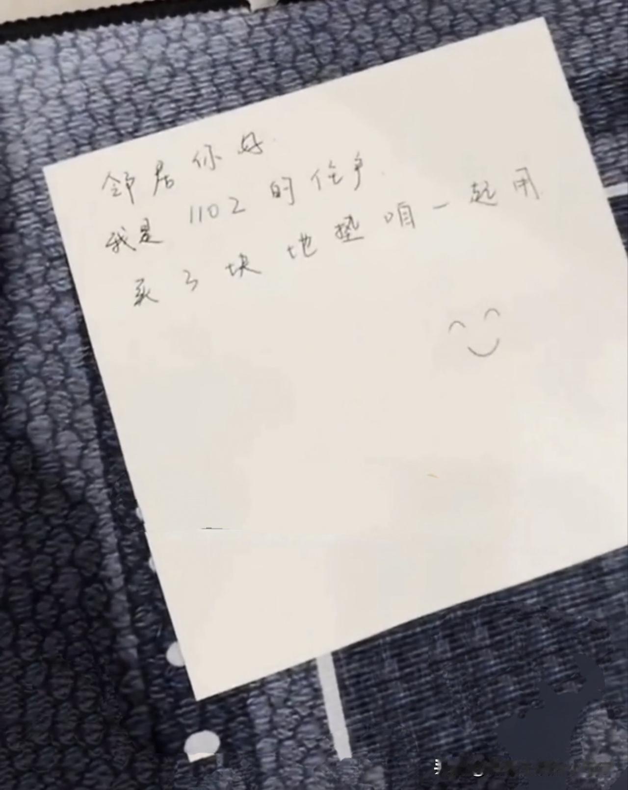 网上都是好邻居,怎么我都遇不到! 看了一则视频,邻居买了一块大地垫,放在两家门口地面上,然后还特意写了一个字条,放在家门口。 字条上写着,我是你1102的邻居,买了三块地垫,咱们两家用。落款还有一个小笑脸的图案。 再看看图3,现实中我家的邻居,弄个鞋架,就放在我家门口对面。地面上瘫的都是孩子的臭鞋。