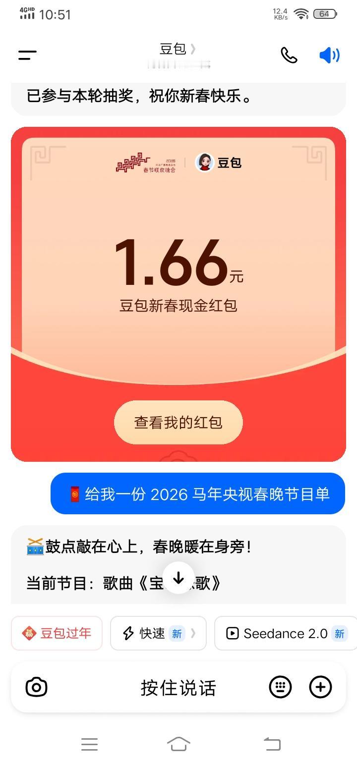大年三十晚上,吃完年夜饭,一家人围在电视前看春晚,我闲着无聊就参加了几个抽奖活动。嘿,还真别说,运气还不错,中了两个奖呢!一个是拜年祝福,另一个是节目单。 虽说这奖品看起来挺小的,但咱参与了活动,就觉得挺有意思的。毕竟过年嘛,就是图个乐呵,能中奖就是个好彩头。 这次抽奖活动里的大奖可诱人啦,有智能机器人、智能汽车,还有8888元现金大奖。想想都让人激动,要是能抽到这些大奖,那可就发啦!不过咱也知道,大奖哪有那么容易中,咱就是凑个热闹,开心开心。 其实啊,参加这种活动,重要的不是奖品大小,而是那份参与的热情和过年的氛围。一家人聚在一起,一边看着春晚,一边抽奖,欢声笑语不断,这才是过年该有的样子。 看着电视里精彩的节目,再想想自己中了奖,心里别提多高兴了。这小小的奖品,就像过年里的一颗糖,甜在嘴里,暖在心里。 新的一年到了,希望大家都能像我一样,有点小幸运。也祝愿大家在新的一年里,身体健康,工作顺利,生活美满,心想事成!就算没抽到大奖,咱也能开开心心地迎接新的一年,把日子过得红红火火! 友友们大年除夕夜抽奖,都抽到了什么?欢迎评论区留言[鼓掌]