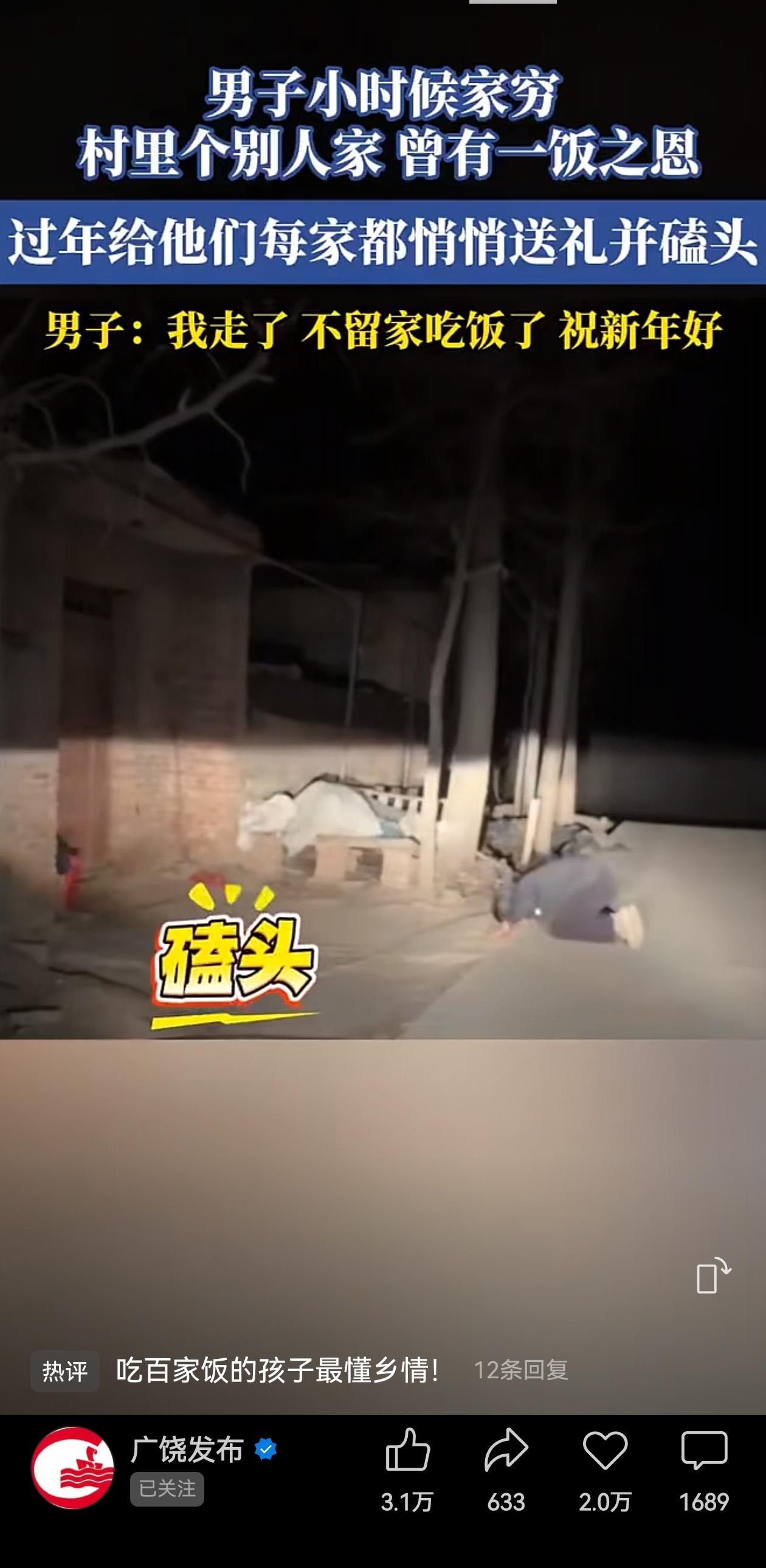 大年初一,被狠狠暖到!男子小时候家穷,受过村里一些乡亲的一饭之恩。如今日子好了,他过年悄悄回到老家,给曾经帮过他的人家一一送礼、还郑重磕头。夜里悄悄来,不打扰,放下心意再磕个头就走。 大年初一看到这个视频让人有点心疼,为这位男子太懂事了心疼。 小时候吃百家饭长大,对邻居来说可能就是“添一双筷子”的事情,但是男子把这份恩情重重记在心里。 因为那些岁月里,特别是农村,邻居们自己也不宽裕,却愿意分他一口的热乎饭。这种情分,他牢牢记在心里几十年,现在有能力了,趁着过年回来还。 而且他还得很小心。 怕人家添麻烦,怕老人张罗饭菜,不让当年的恩人觉得“他现在发达了,我得招待好”。 还恩的方式放得很低,低到了尘埃里。默默奉献礼物还不算完,还对每一户恩人郑重磕头,用传统里最重的礼,还自己报恩的心! 有网友说这叫“不攀附、不打扰,只报恩”,说得太准了,他怕自己的“回报”变成别人的负担,所以宁可在夜里放下东西就走,把那份温暖留在门里,自己知道报了恩就可以了,安安静静的还了良心上的债…… 什么叫体面?这就是体面。不是穿多贵的衣服,开多好的车,记得别人的好,懂得报答,这种长在骨头里的善良最体面。 一位网友说得好:“吃百家饭长大的孩子,最懂人情味,也最懂怎么还人情味”! 吃百家饭长大的孩子,最懂感恩与乡情。不张扬、不攀附,默默涌泉相报,这不是最体面的善良吗? 信息来源:广饶发布