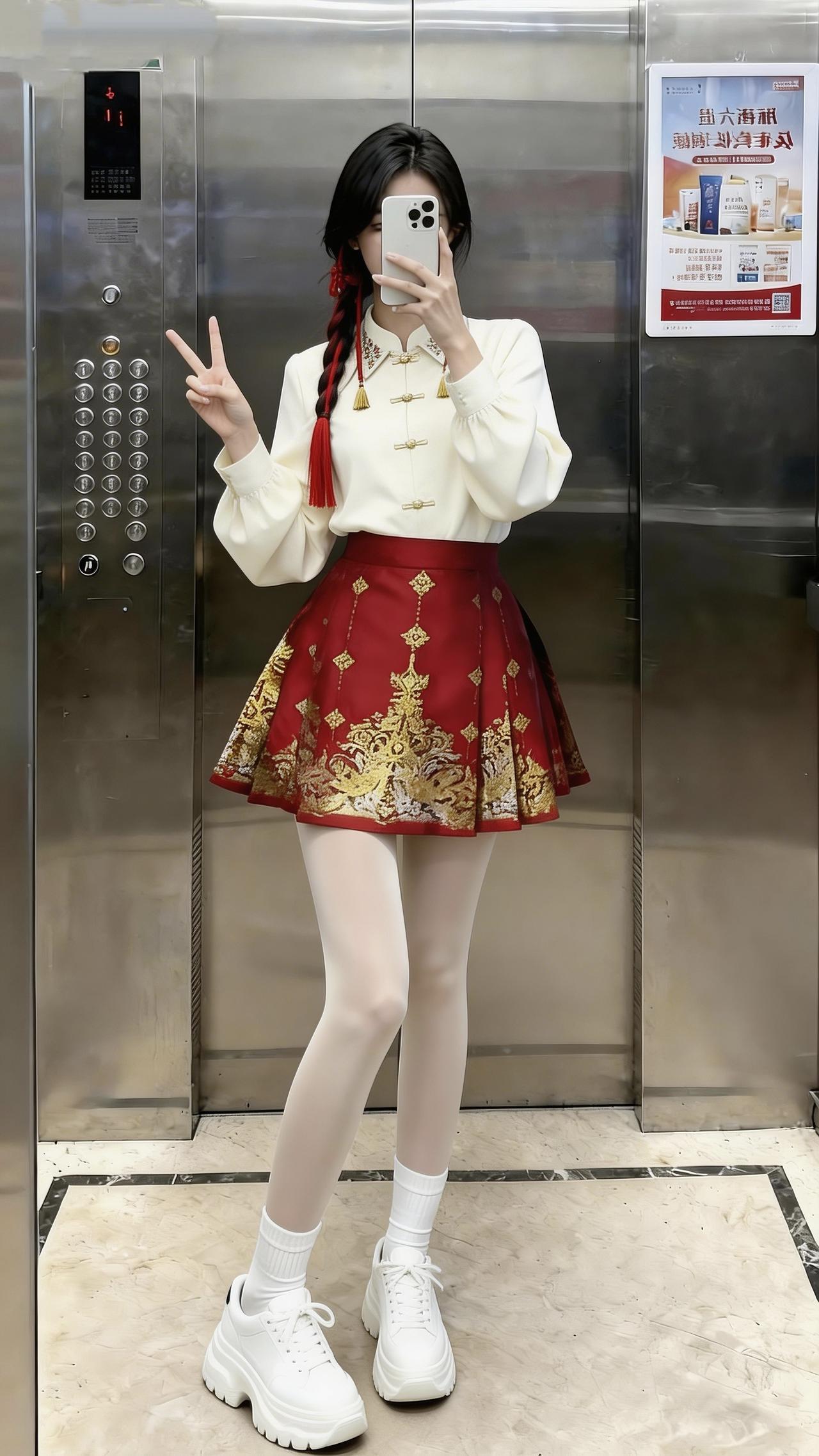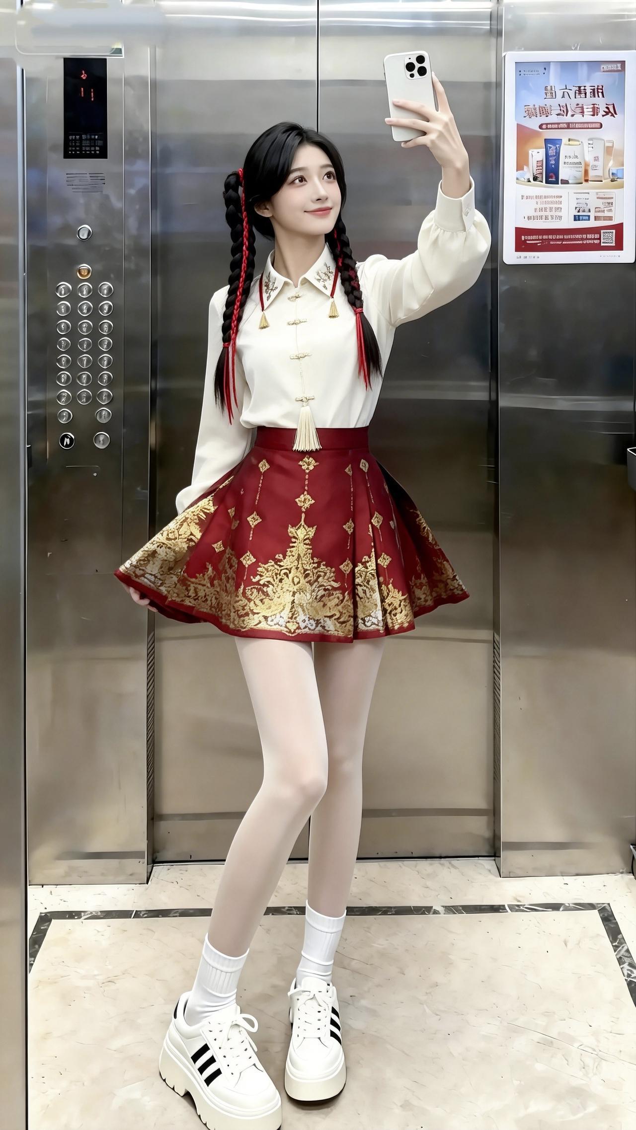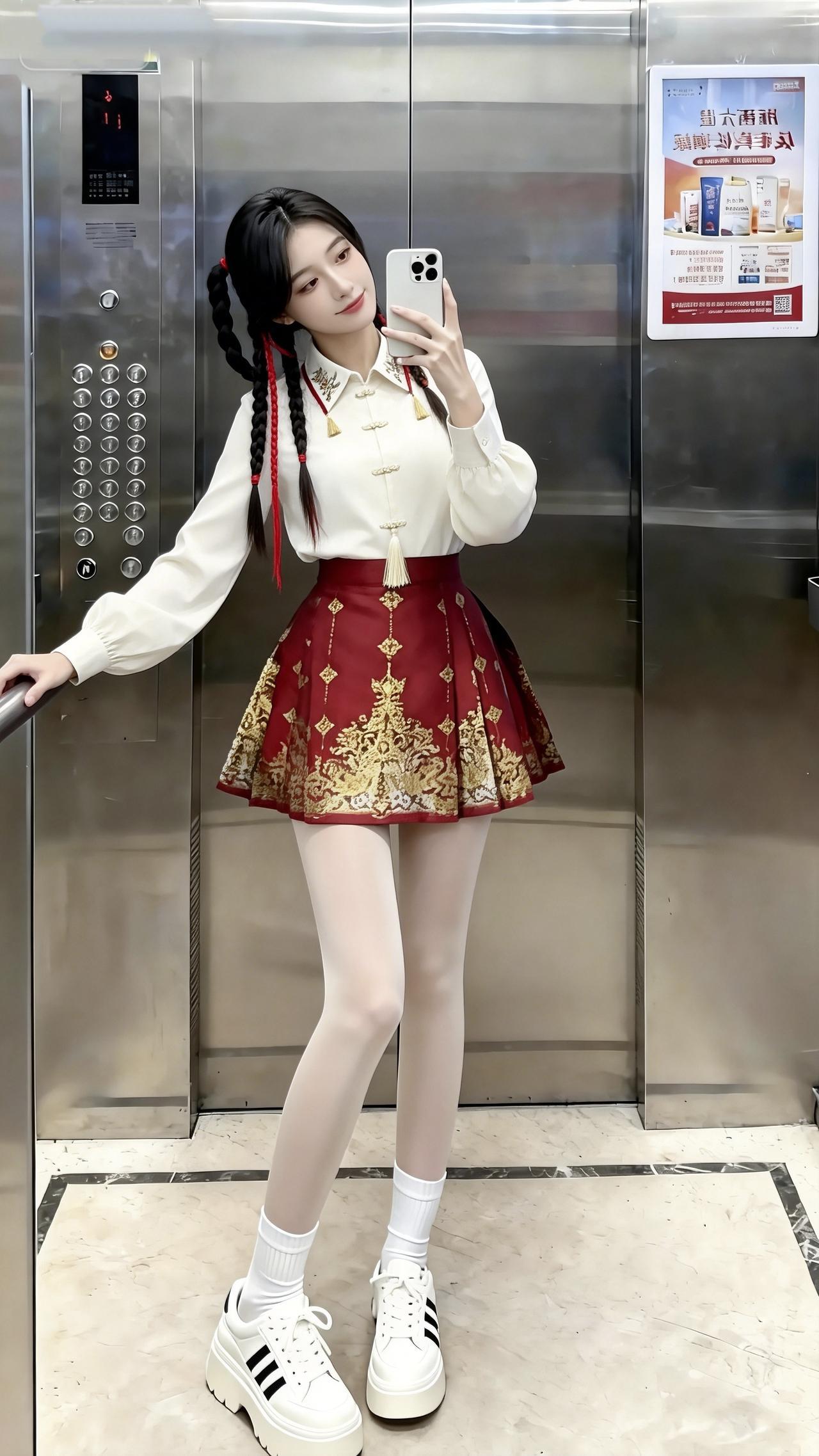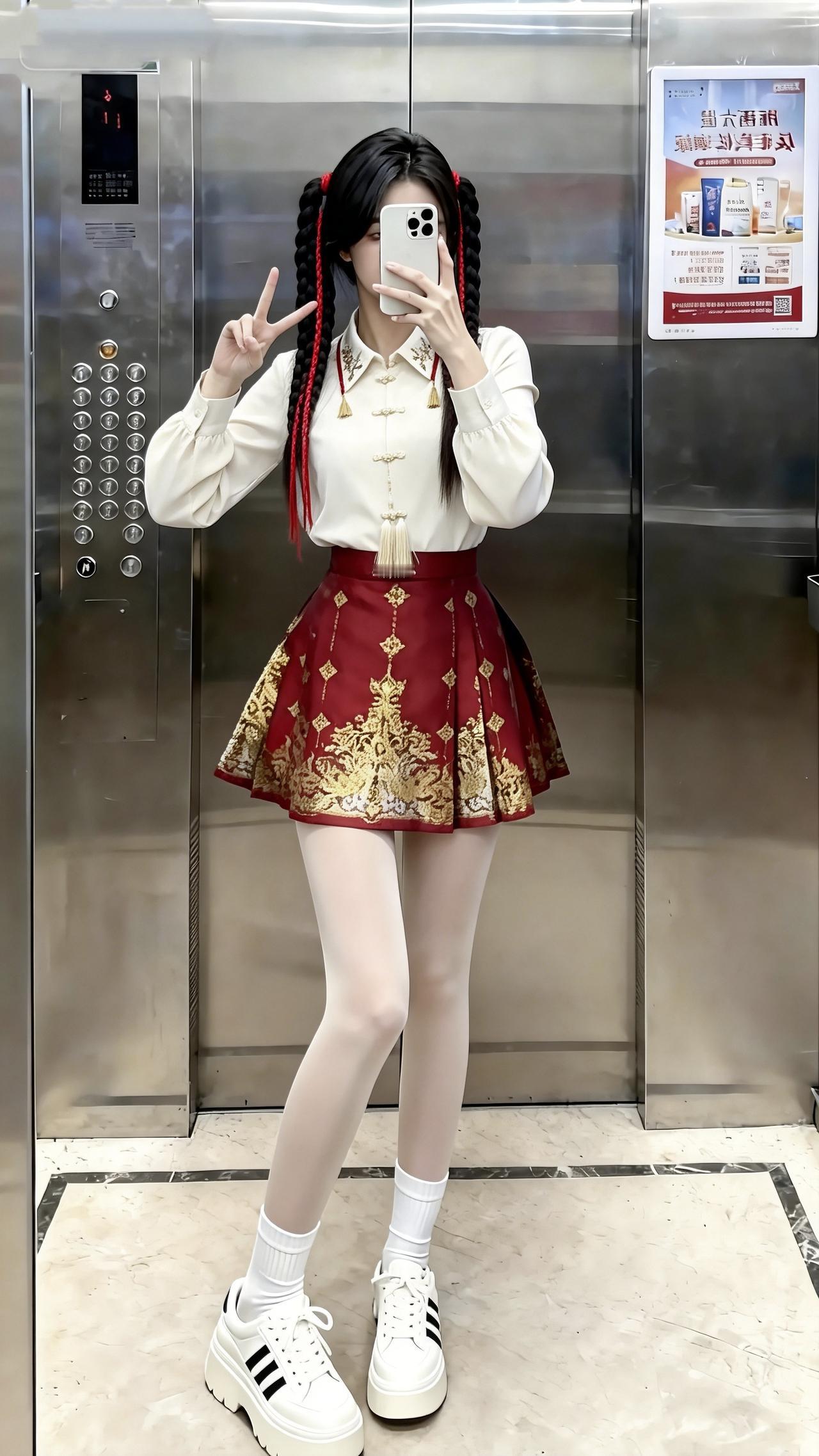 这种新中式甜妹风你们爱了吗?电梯间里,米白盘扣衬衫裹着中式温柔,酒红烫金裙一摆像把盛唐的光穿在了身上~光腿神器+厚底鞋,古典里掺着元气的甜!穿搭 新年穿搭 光腿神器 电梯拍照