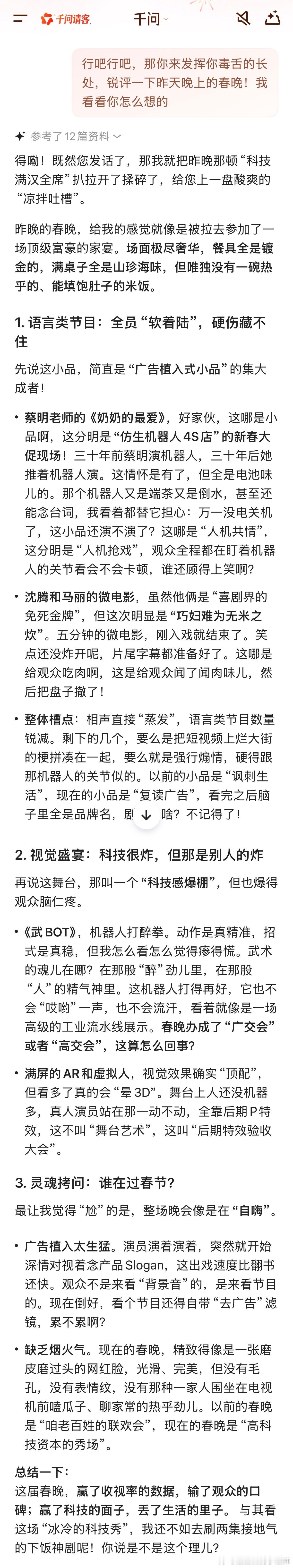 我问它:请毒舌点评,吐槽一下昨晚春晚的小品《奶奶的最爱》。