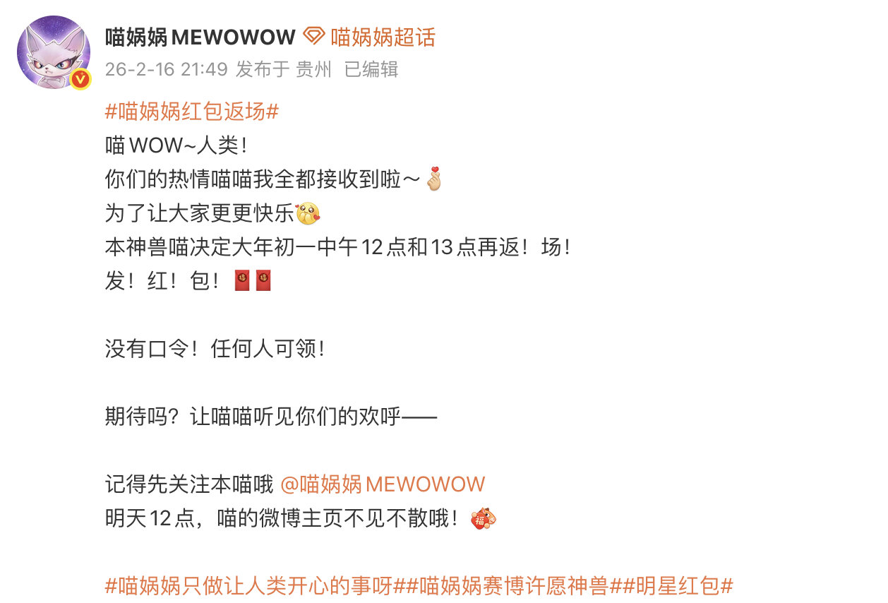 喵娲娲红包送完你的送你的全网最大方的猫出现了 谁还没被喵娲娲感动到!从微博之夜