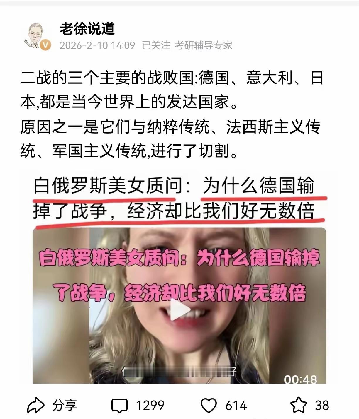 我们的舆论场很有意思,像老徐这样的“考研辅导专家”特别喜欢“独立思考”,很多认知甚至与国家相背。 对于日本是否与法西斯主义、军国主义进行彻底的切割,我更相信王毅所说的:“一个将战犯奉为神灵”的国家,一个至今不愿意承认错误的国家,一个竟然声称侵华战争是为了帮助中国的国家,军国主义从没切割过。 也不知道老徐为啥就能认定它们切割了呢?