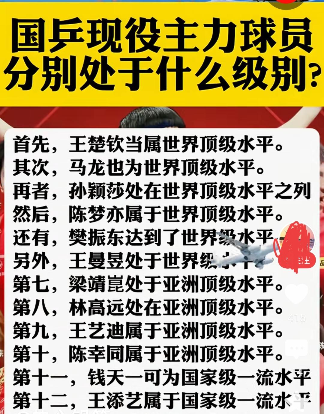下文作者的描述和评论,让人看后心里不是个味儿!只能嗤之以鼻!! 什么王楚钦当属世界顶级水平,而对樊振东的评述是,达到了世界级水平,看了十篇是世界级水平,而不是世界顶级水平,此评论者对樊振东有多大的成见呢,还有对王曼昱的评论! 王楚钦当属世界顶级水平,看不懂,为什么是当属呢,当属的为什么在再三天之内败樊振东两次呢!马龙也为,好勉强的评述!孙颖莎处在,好为难的评说!陈梦亦属于,极不情愿的承认! 此评论者对樊振东的评论,是樊振东勉为其难地达到了世界级水平,而不是世界顶级水平!王曼昱是世界级水平!!! 这小文作者站队实在太明显,硬抬王楚钦,硬压樊振东!!