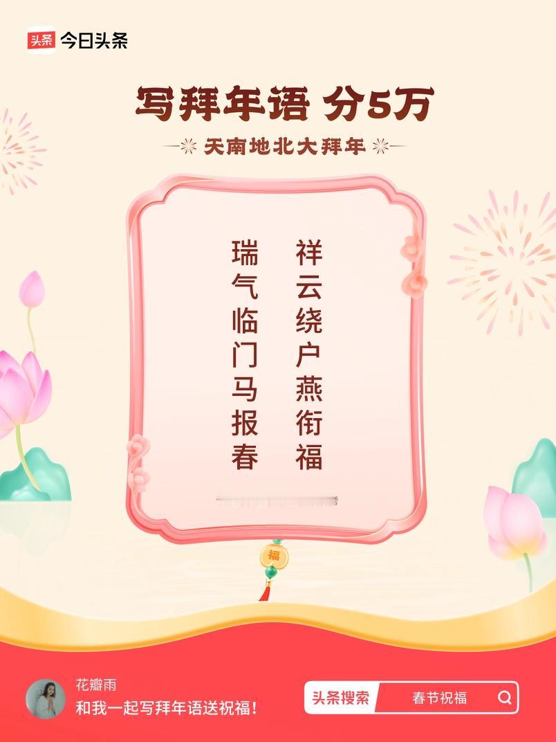 写拜年语送祝福新春拜年送祝福!我的祝福是:“瑞气临门马报春,祥云绕户燕衔福”!快来一起写祝福吧戳这里,一起领红包>